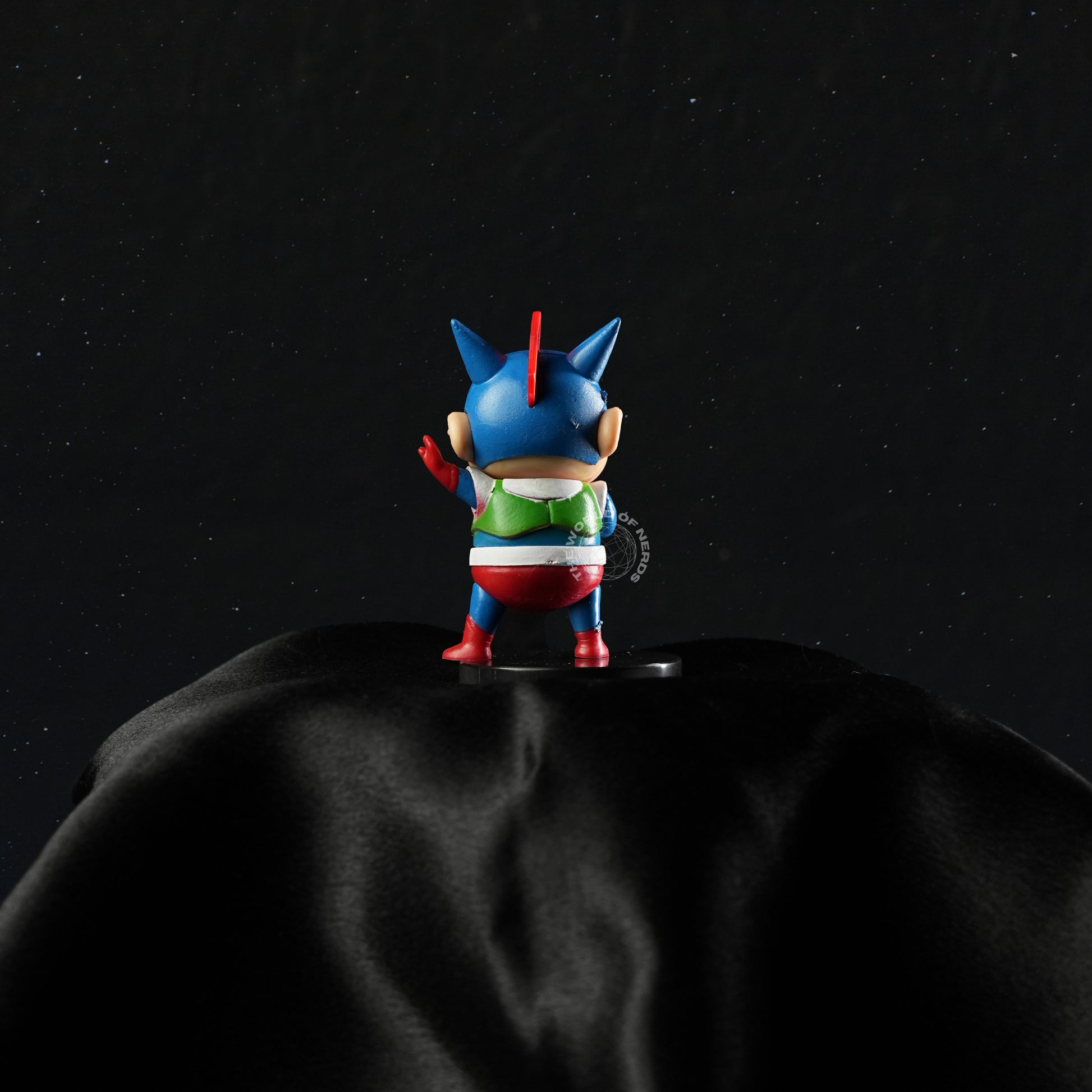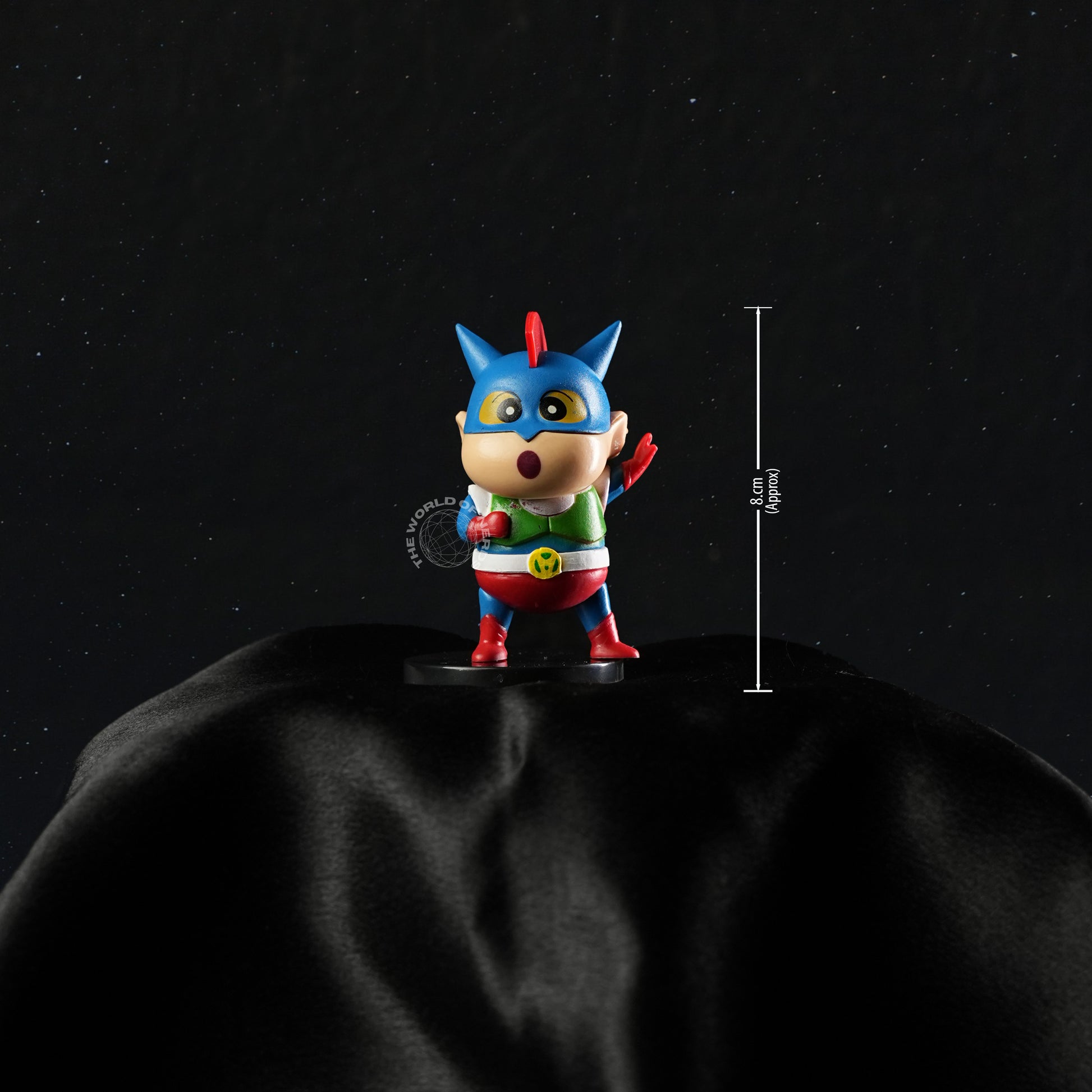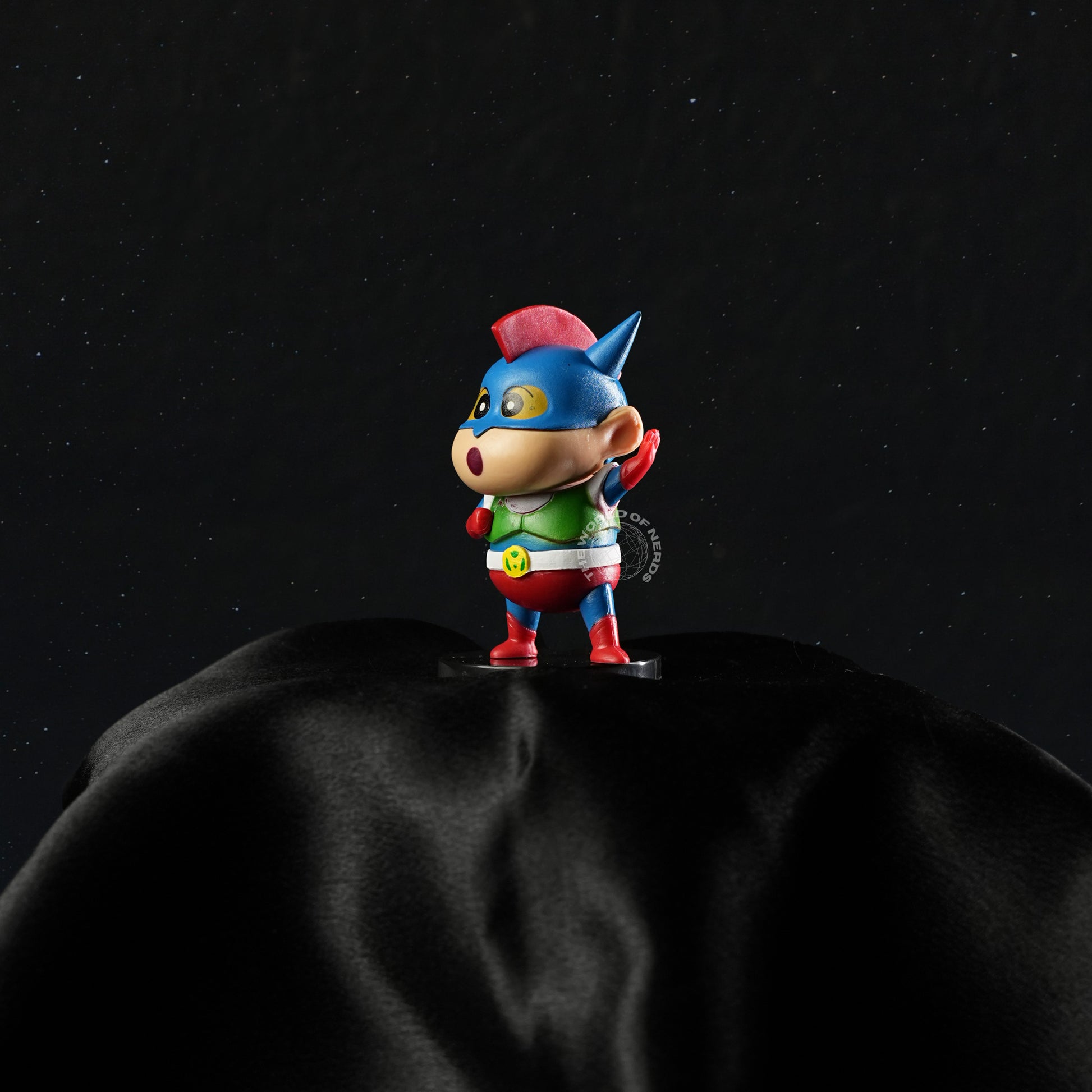 Standing proudly atop a smooth black fabric peak, under a star-dotted sky, this 8 cm Action Shinchan figure radiates courage, chaos, and cuteness. Dressed in his signature superhero outfit with wide eyes and a raised hand, he looks like he’s about to deliver his most dramatic line yet. The spotlight effect and galactic background create a scene that feels heroic yet playfully exaggerated—just like Shinchan himself. It’s a blend of laughter, imagination, and childhood heroism, wrapped in a tiny collectible full of personality.