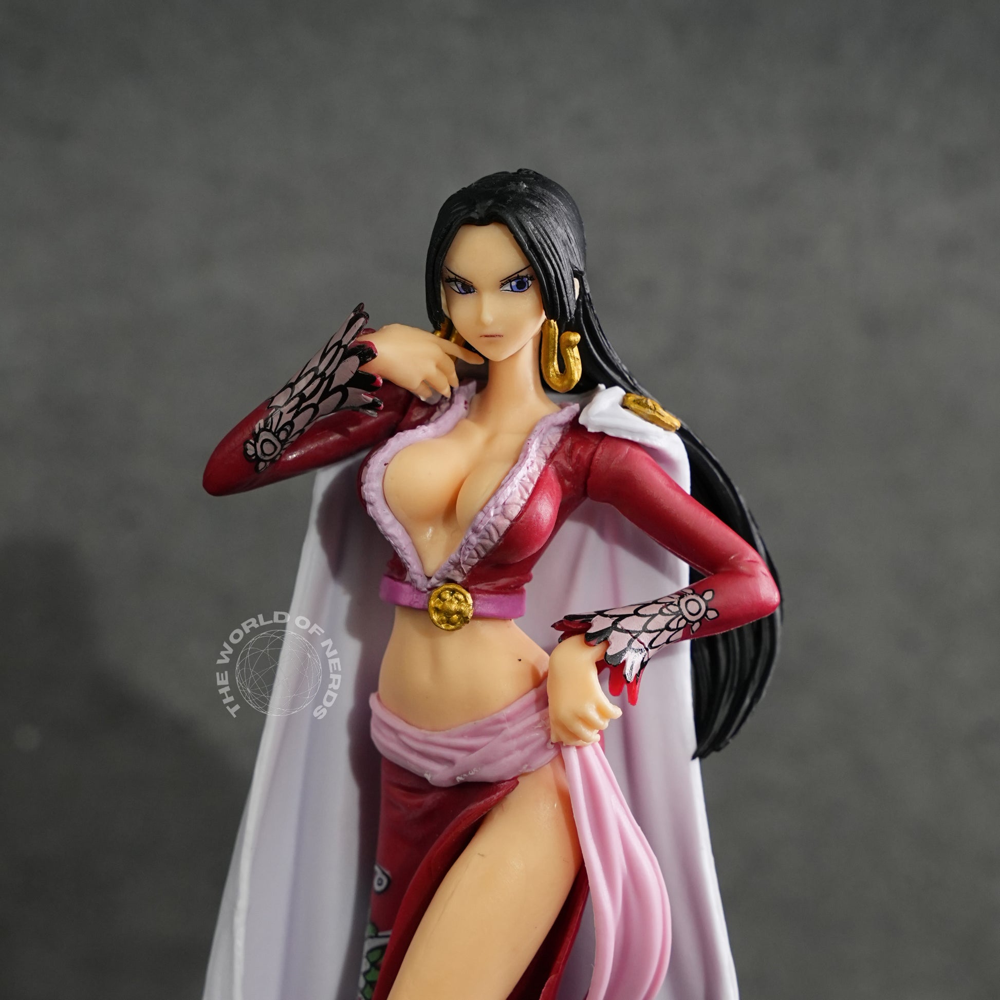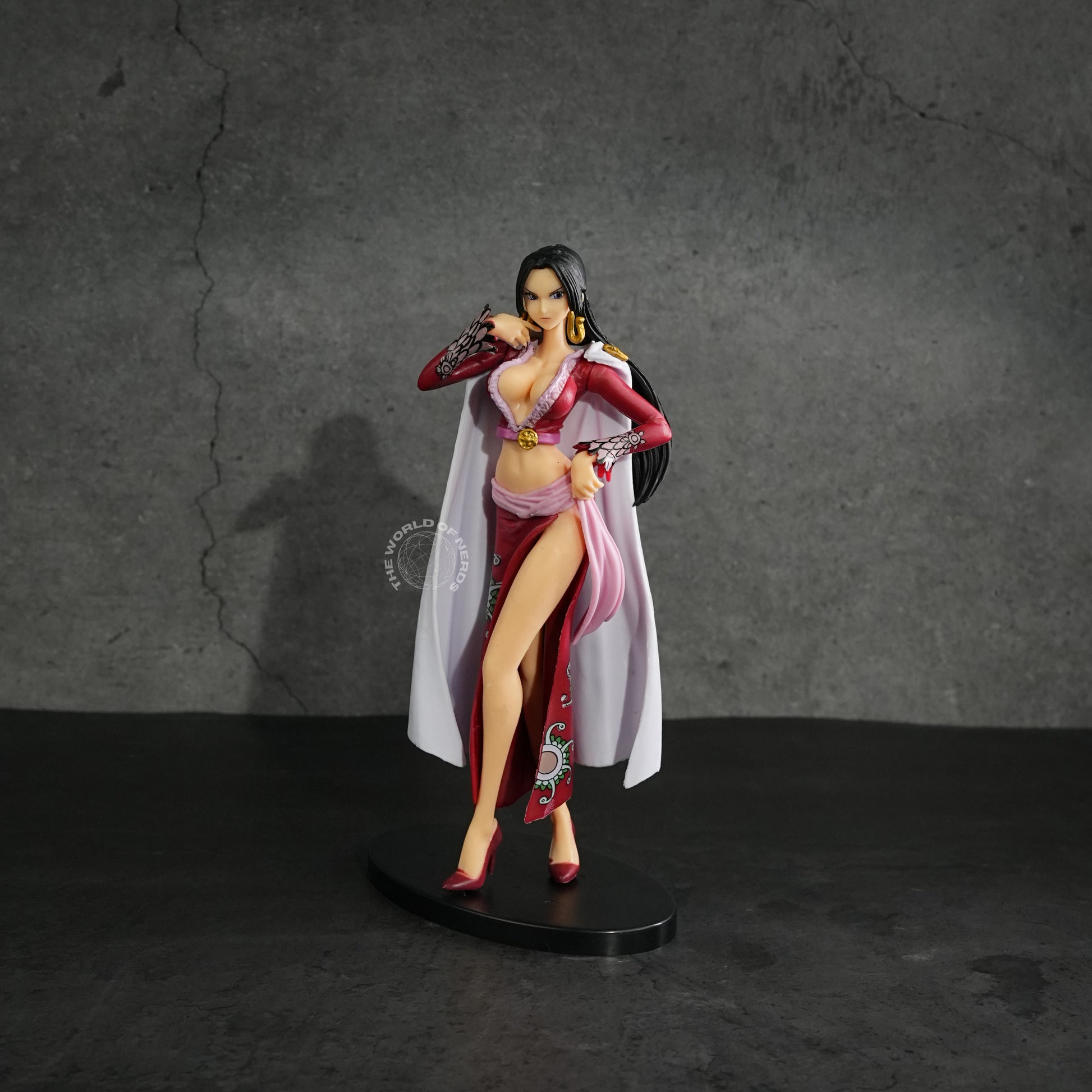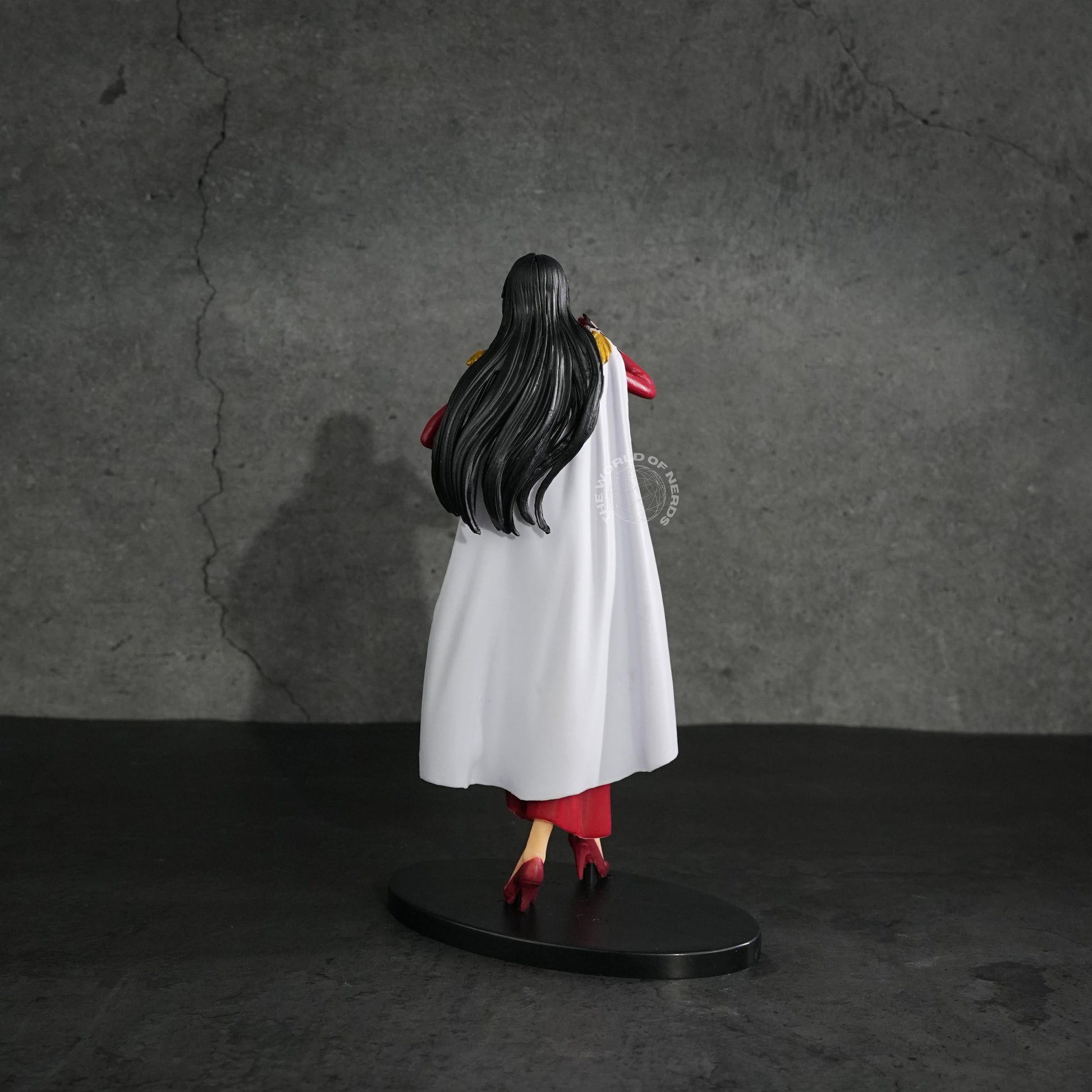 Adorning a backdrop of deep, textured grey, a resplendent figurine of Boa Hancock, the esteemed Pirate Empress, stands with an air of captivating majesty and unassailable confidence. She is elegantly portrayed in her signature ensemble: a deep crimson, flowing dress that gracefully reveals a leg and her midriff, paired with a sweeping white cloak that billows behind her shoulders. Her long, raven hair frames a face where one hand is poised near her cheek, accentuating her striking features and golden accessories. Her expression projects a compelling mix of haughty beauty, undeniable self-assurance, and a subtle hint of the complex emotions that lie beneath her formidable exterior. This stunningly crafted figure, approximately 17 cm in height (akin to a small desk lamp), is securely anchored on a sleek, black circular base. The entire presentation powerfully encapsulates Hancock's legendary beauty, her commanding presence, and the enigmatic allure that defines her as a queen among pirates.