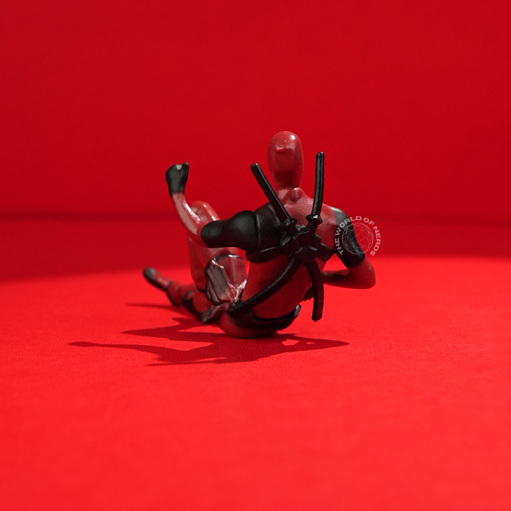 Set against a striking red background, this compact Deadpool figure—about 8 cm long and 5 cm tall—reclines in classic “too cool to care” style. One hand casually supports him while the other throws a bold thumbs-up, adding his signature mix of sass and confidence. The moment feels playful yet smug, like he's just wrapped up a wild adventure and decided to take five. It’s equal parts comedy, charisma, and chaos—just like the merc himself. A fun collectible that brings personality to any shelf or workspace.
