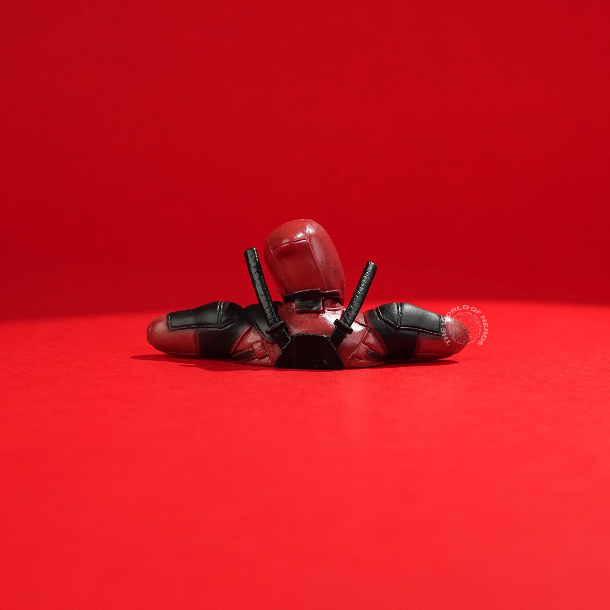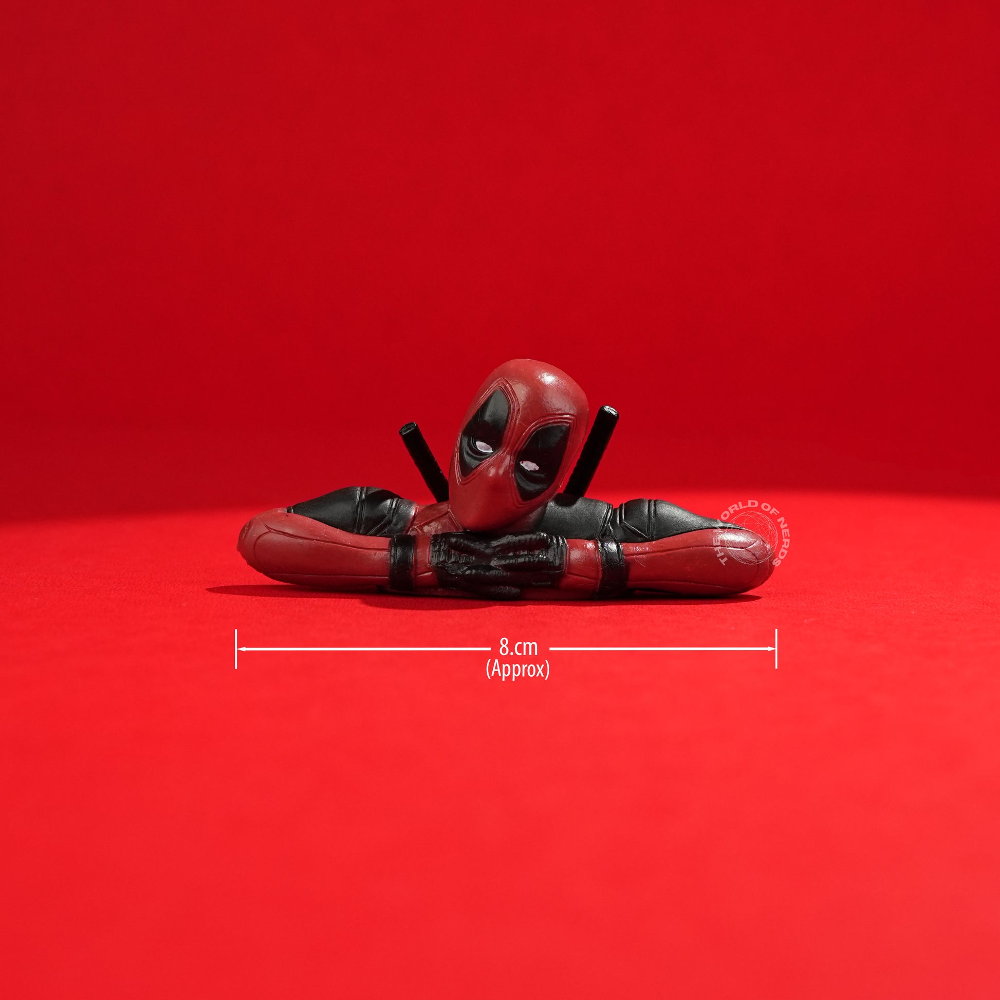 Lying flat with his arms folded and chin resting, this approximately 8 cm Deadpool figurine looks oddly peaceful—like a mischievous warrior caught in a quiet moment. Framed by the same deep red as his suit, he stares upward with wide eyes, plotting his next move—or his next joke. It’s a playful yet introspective scene, mixing calmness with a hint of sarcasm, just like the character himself. Whether he's watching the clouds or silently judging the room, this mini collectible brings a quirky stillness that fans of the merc will absolutely love.