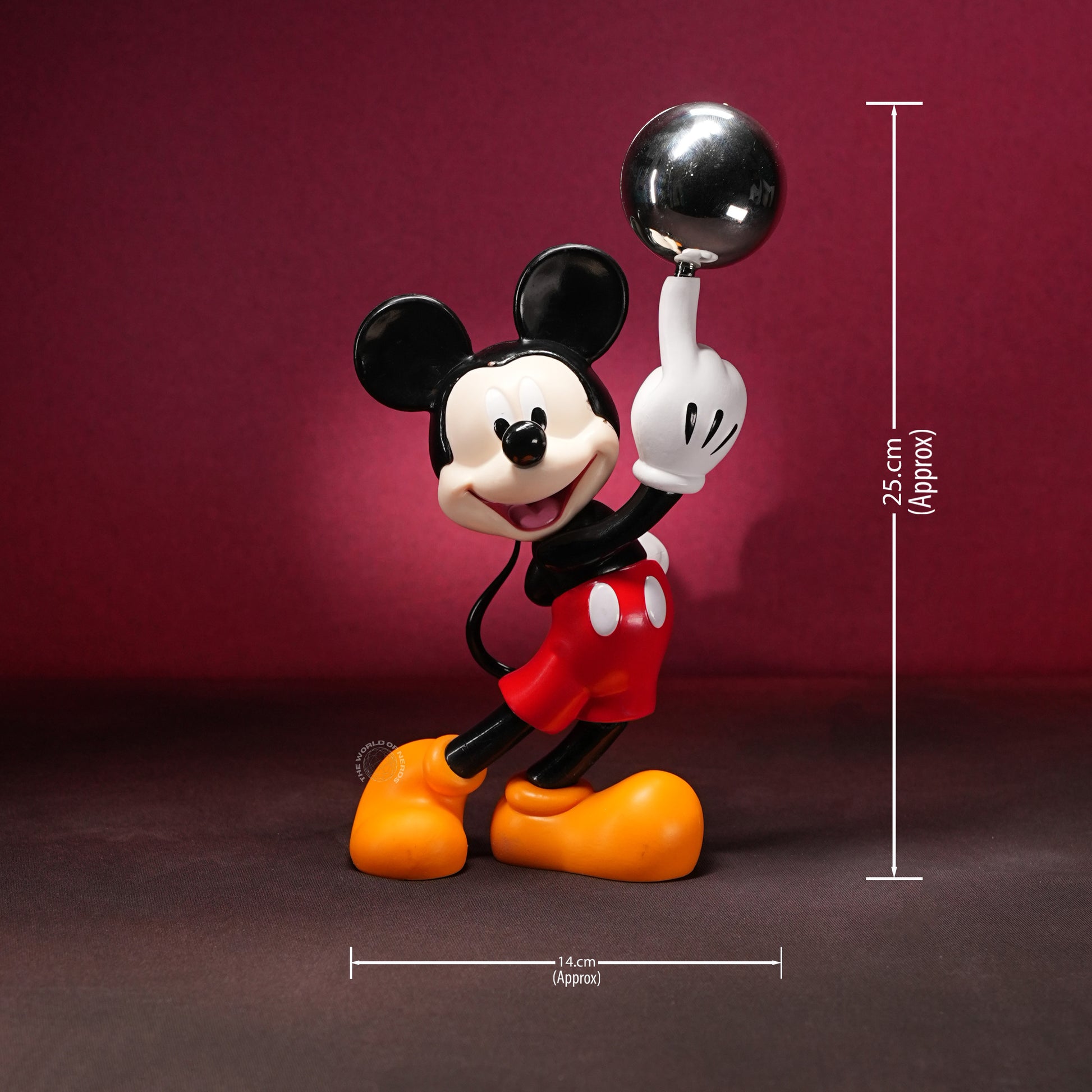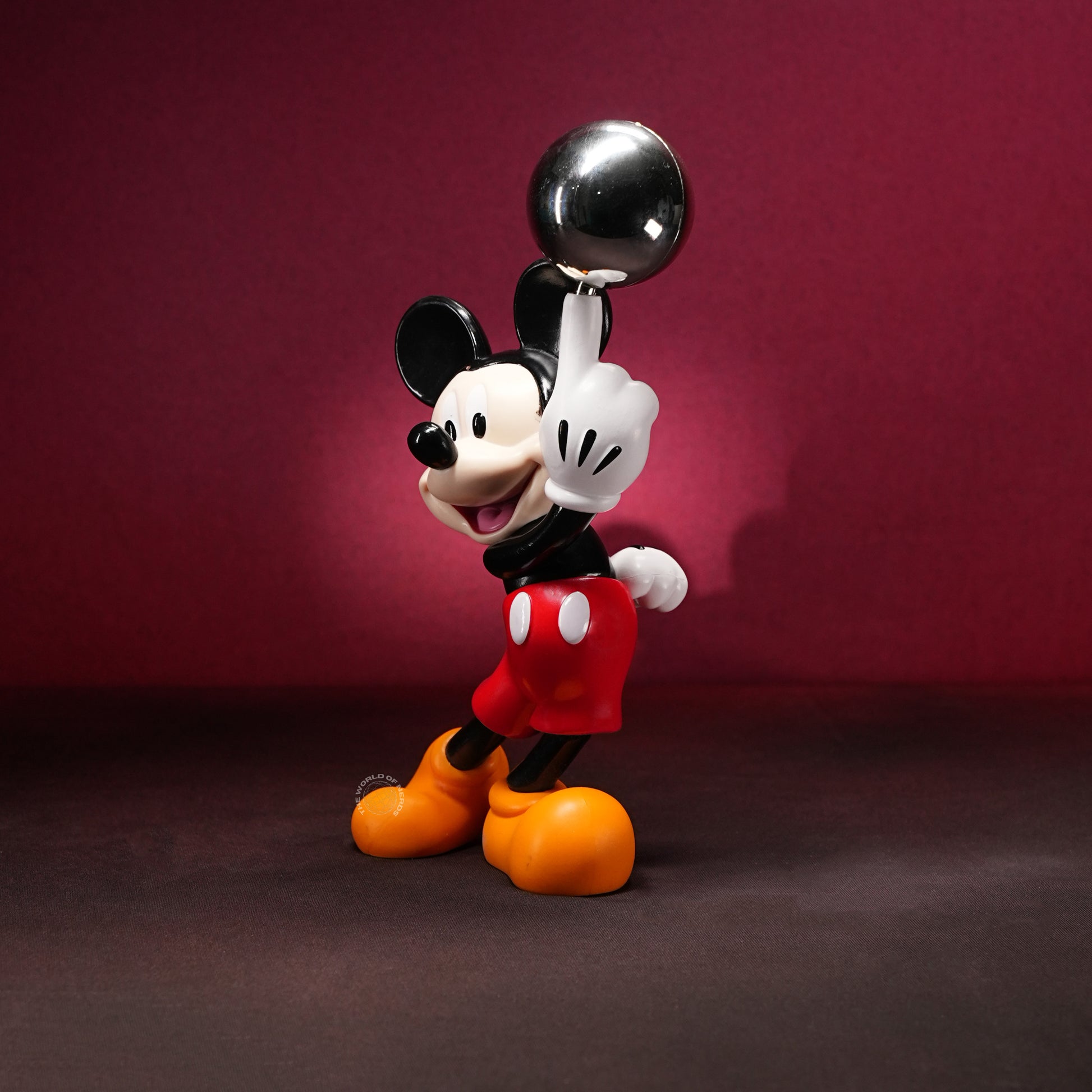 Framed against a rich maroon backdrop, a brightly colored Mickey Mouse figure stands confidently on a dark surface, measuring approximately 25cm in height and 14cm in width. With his trademark wide smile and vivid yellow shoes, Mickey playfully balances a shiny silver ball on his raised finger—his cheerful pose brimming with the magic of childhood and the spirit of adventure. The vibrant figure feels almost alive, radiating joy and mischief, yet seen in the soft shadow of adulthood, it also calls forth a tender longing for simpler times. This scene captures the bittersweet beauty of growing up: delight spun effortlessly atop nostalgia, where cherished memories and attainable happiness stand side by side, measured simply in centimeters yet carrying a lifetime of smiles.