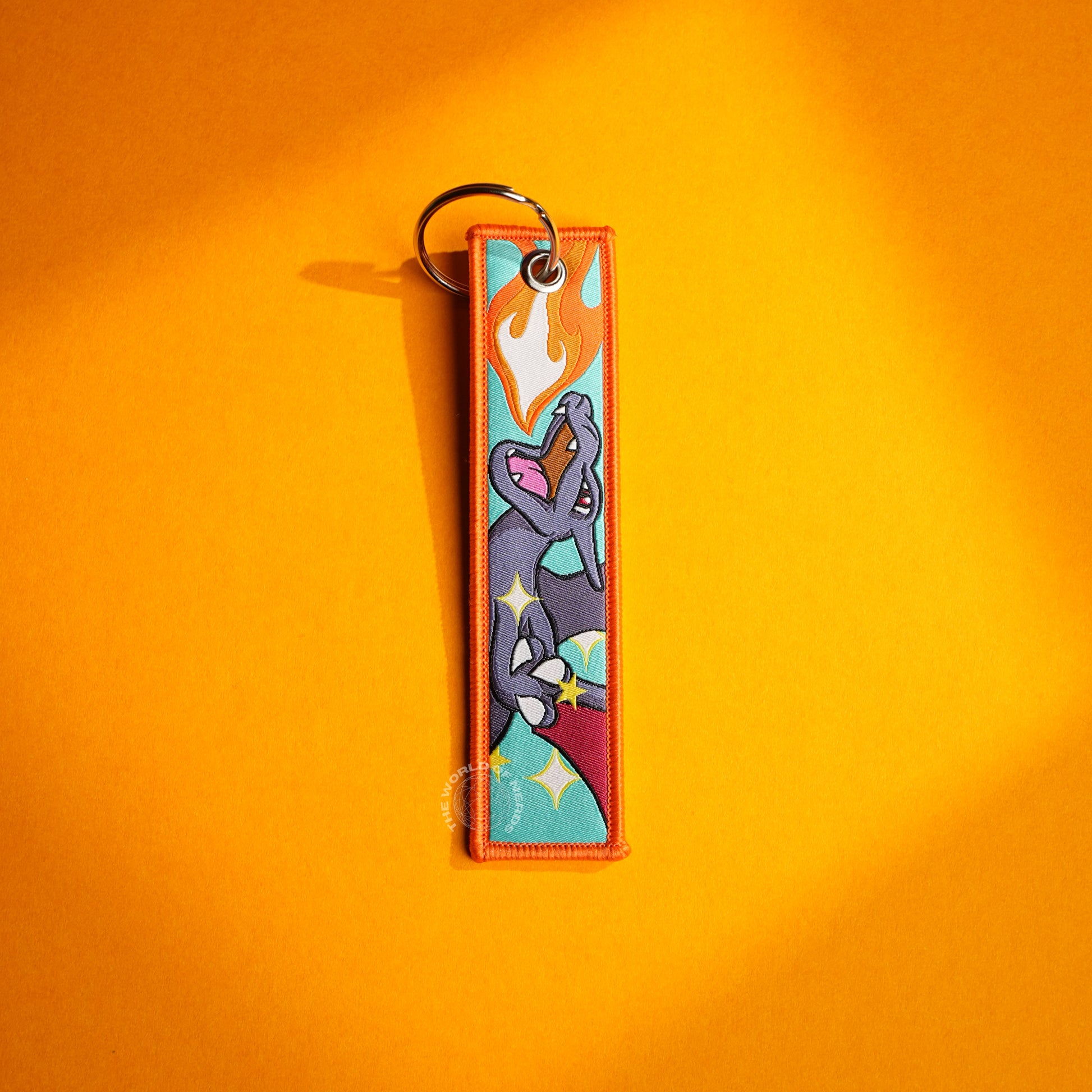 These eye-catching keychains feature embroidered versions of Charizard and Gengar, each with fiery and sparkling designs that add a playful yet bold touch to any set of keys. The vibrant orange backdrop complements the characters’ intense expressions, capturing a mix of fierce power and mischievous charm.