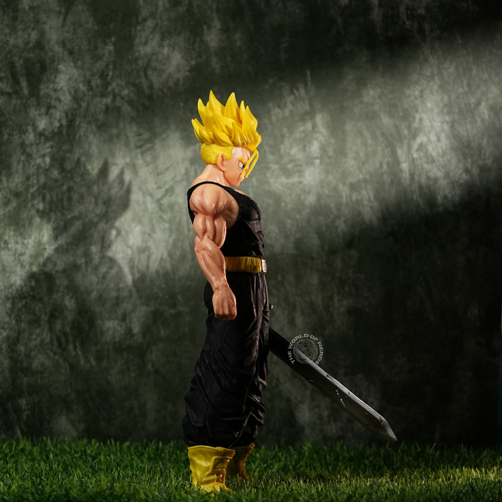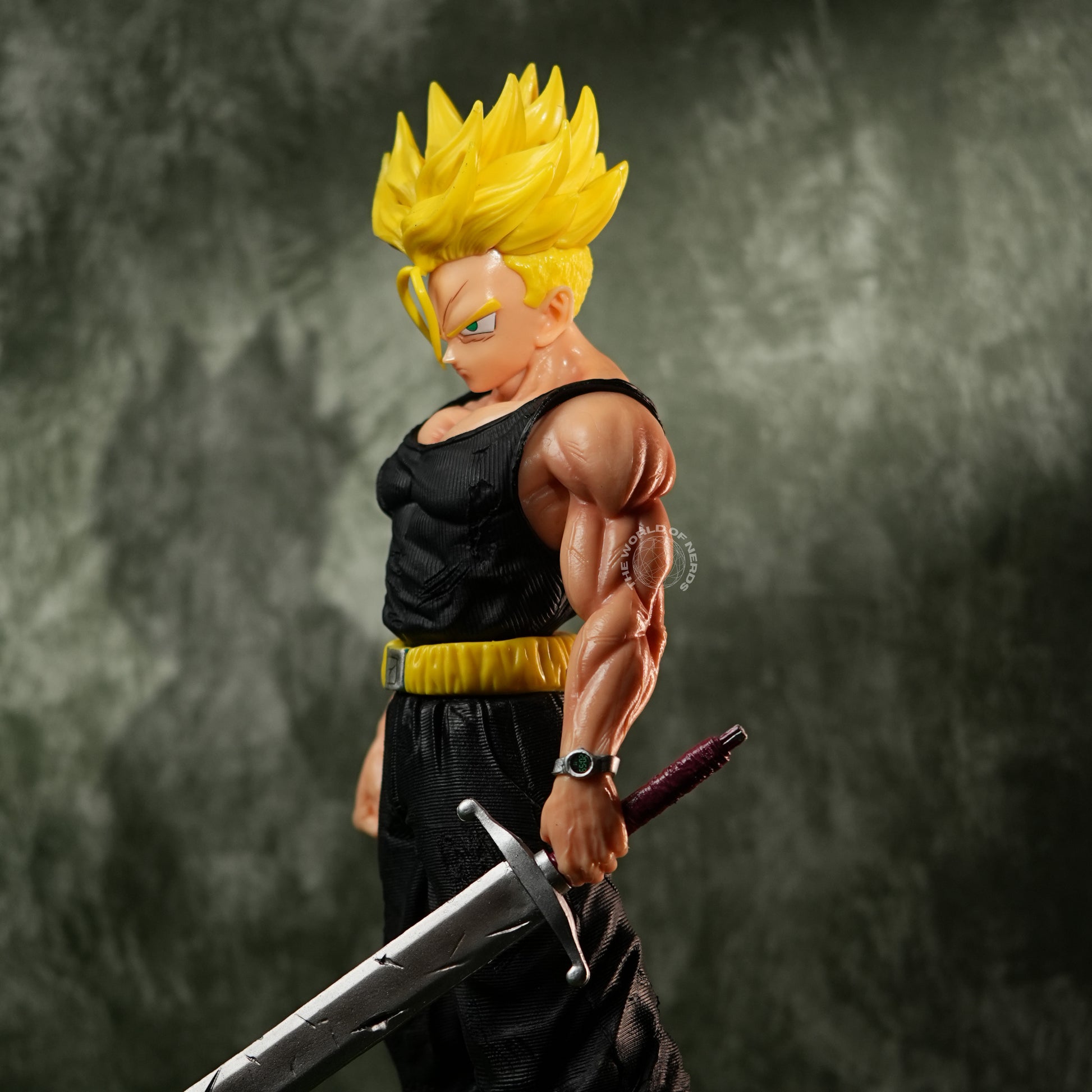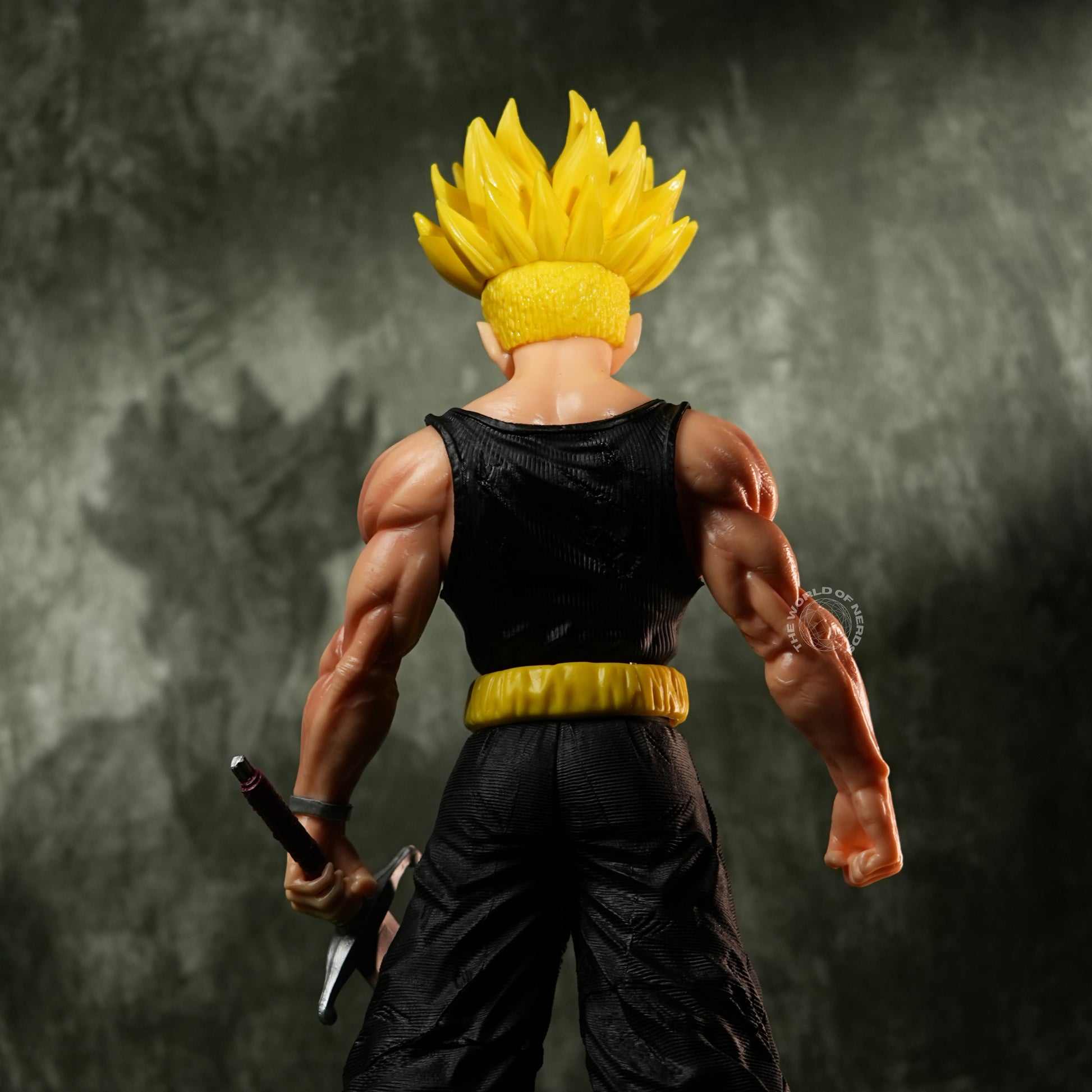 This 41 cm (approx.) figure of Gotenks in Super Saiyan form embodies the raw strength and energetic spirit of the fusion warrior. With his sword in hand, the figure radiates an air of both determination and readiness for battle. The muscular build, along with the fiery glow of his golden hair, reflects Gotenks’ powerful transformation. This collectible perfectly blends the fiery energy of the Saiyan legacy with the playful confidence of this unique fusion. It’s a powerful depiction of Gotenks at his peak.