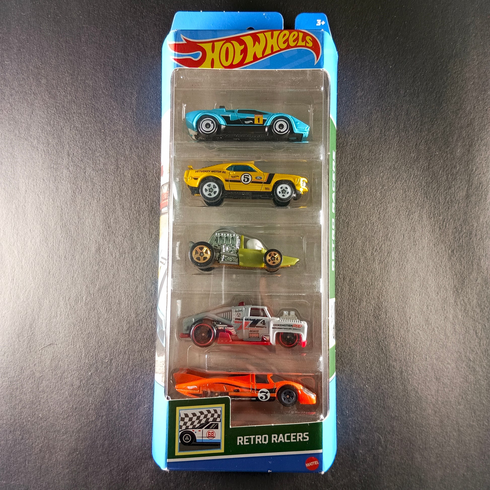 Introducing the HOT WHEELS RETRO RACERS SET OF 5! Experience the thrill of speed with this collection of retro-inspired racers. Featuring 5 unique designs, these cars are sure to impress. Perfect for collectors and kids alike, these cars are crafted with precision and attention to detail for a truly authentic racing experience.