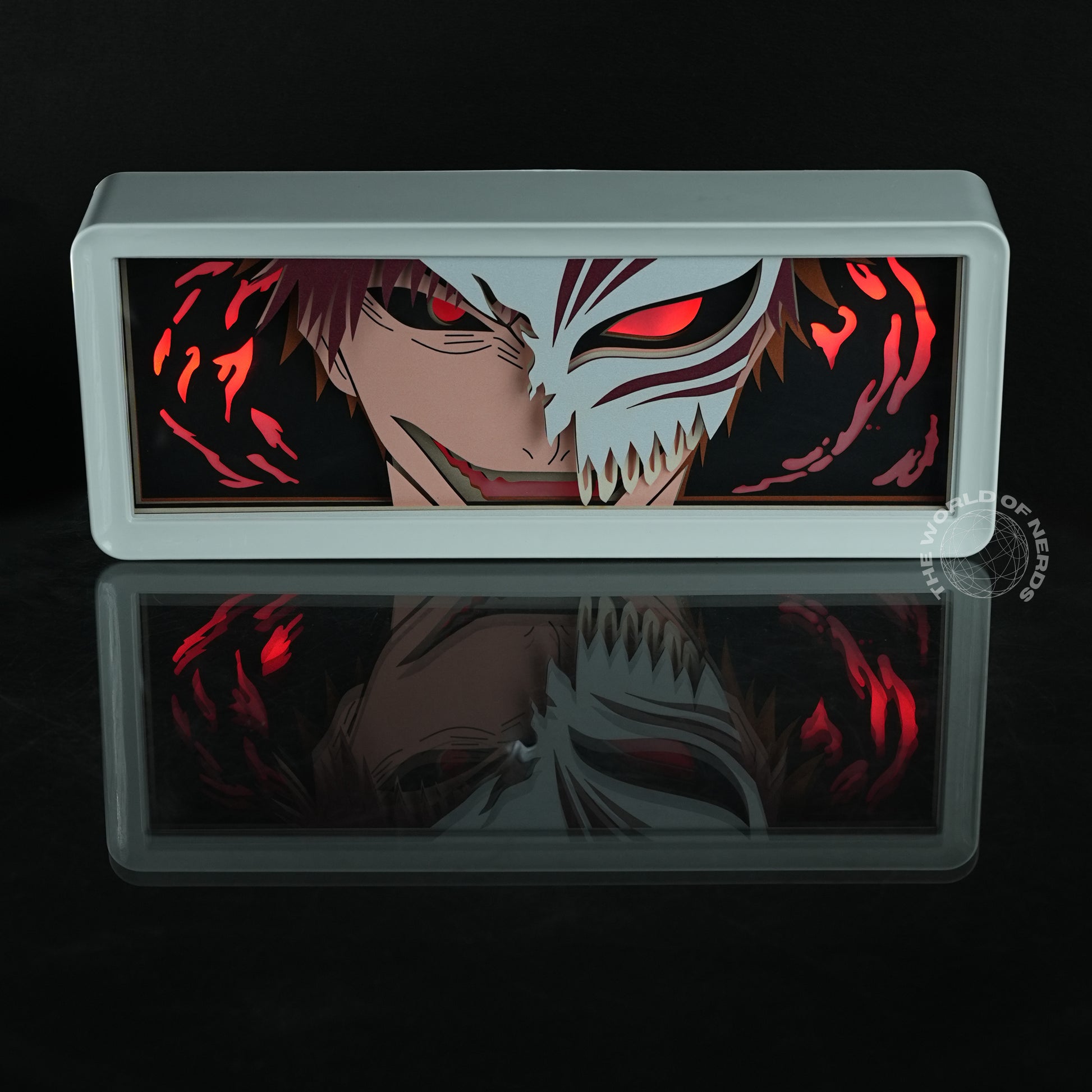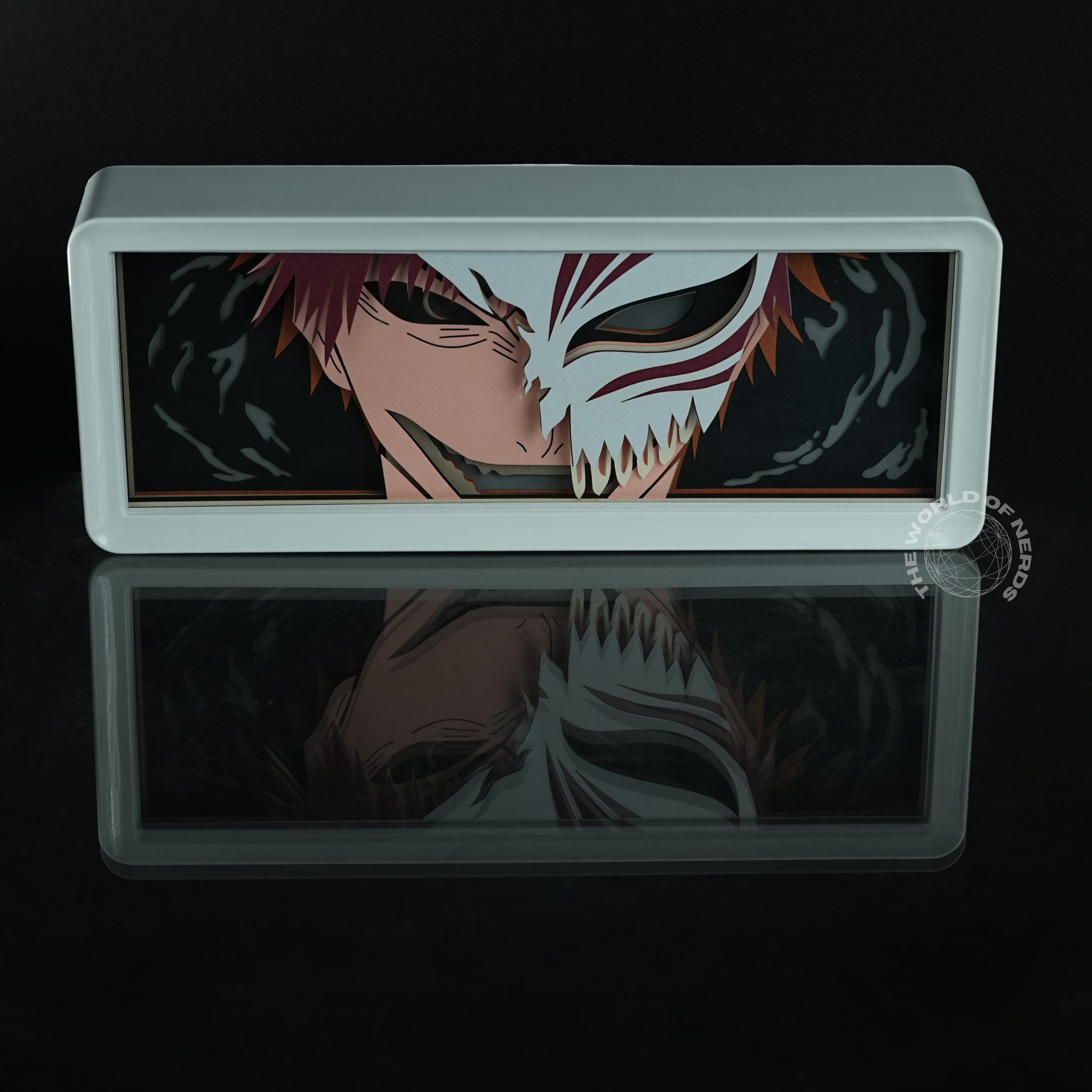 Encased in a clean Approximately 26cm x 10cm frame, this chilling artwork captures Ichigo from Bleach mid-transformation into his Hollow form. The sinister smirk splitting his face, with one side masked and the other exposed, reflects the brutal conflict within — a raw duality of control and chaos. The dark, swirling background enhances the ominous energy, while the sharp white and crimson lines of the mask pierce the darkness like a warning. The glass-like reflection beneath deepens the drama, making it feel as though Ichigo's darker side is watching from beneath the surface, waiting to rise. A must-have for any fan drawn to the edge between hero and monster.