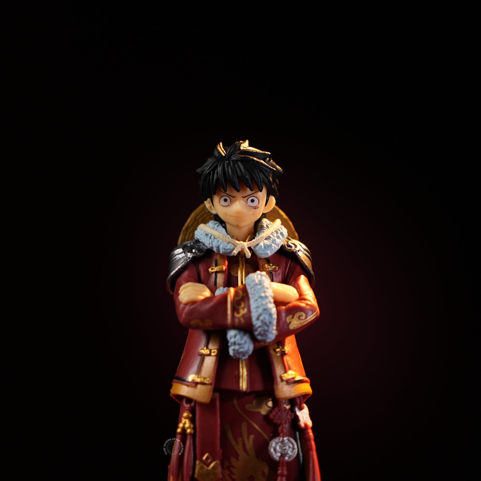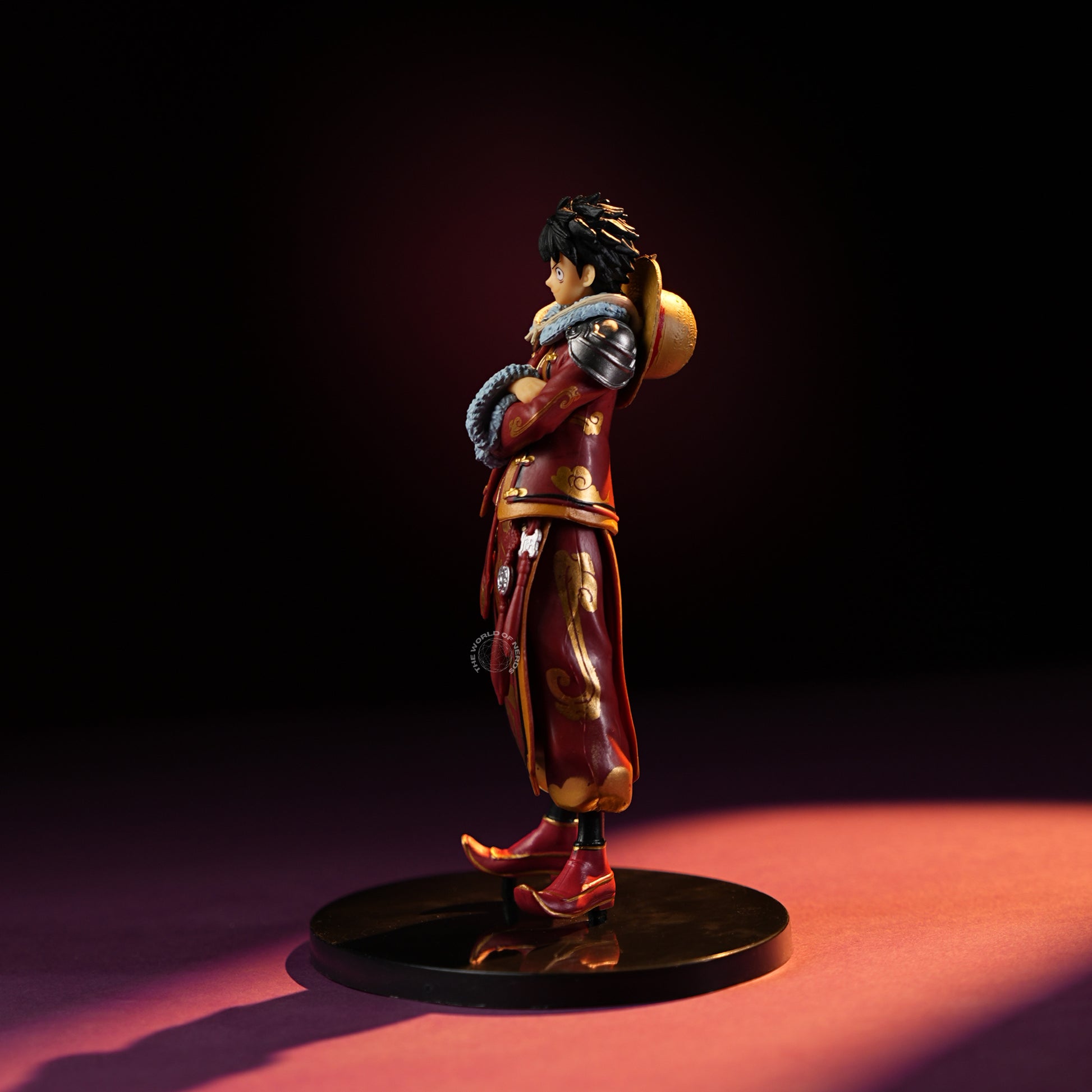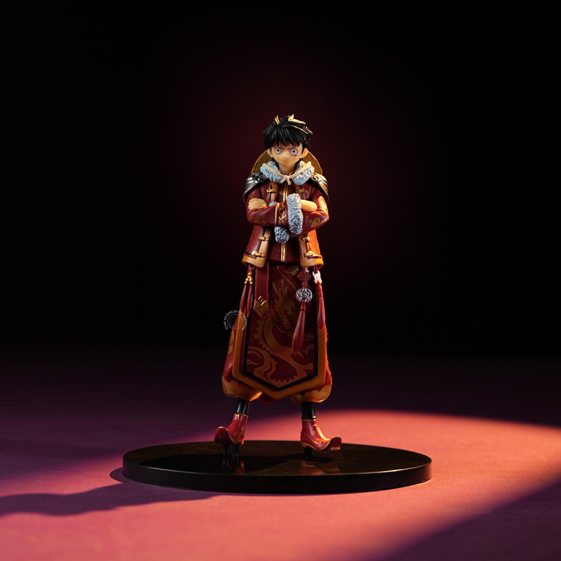 Standing around approximately17 cm tall, Monkey D. Luffy commands attention in his luxurious red imperial robe, richly decorated with golden dragon motifs and fur-lined details. His bold, crossed-arm stance perfectly embodies the fearless resolve of a pirate king combined with the regal poise of a true leader. Illuminated by a warm, focused light, the fine craftsmanship of his attire and accessories highlights every intricate detail, making this figure a stunning homage to the iconic One Piece captain.