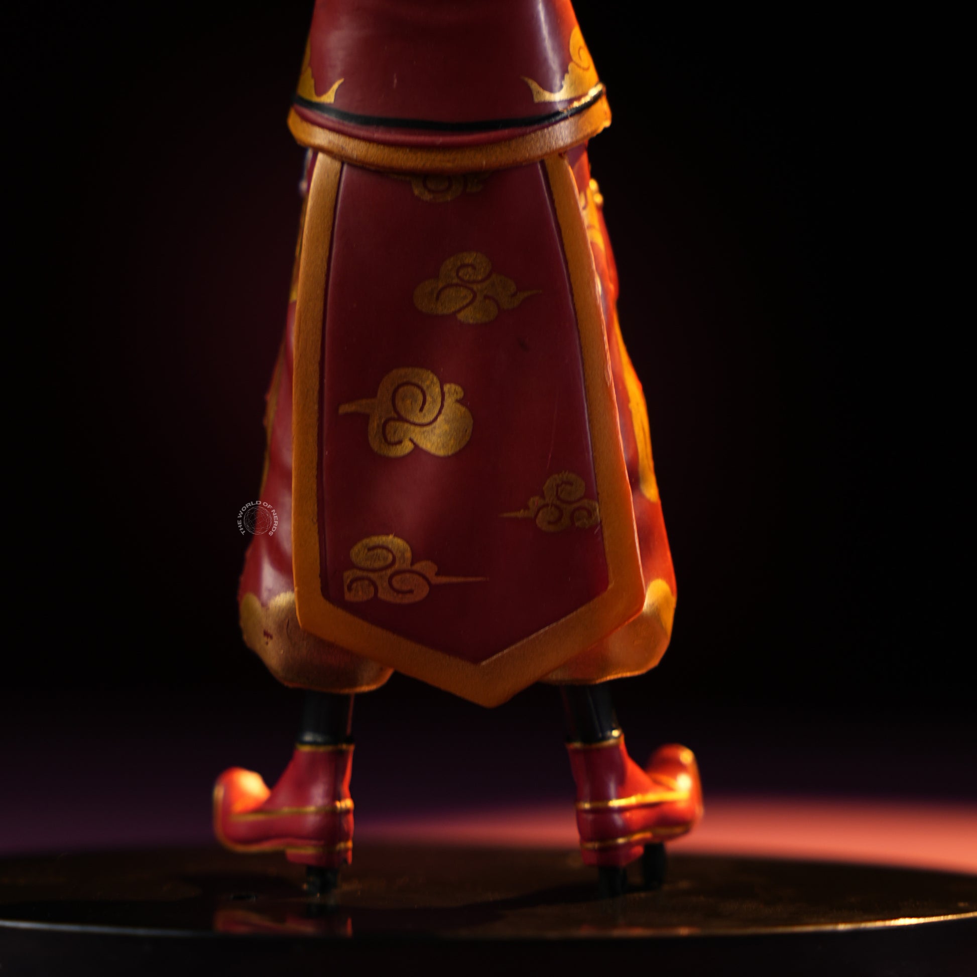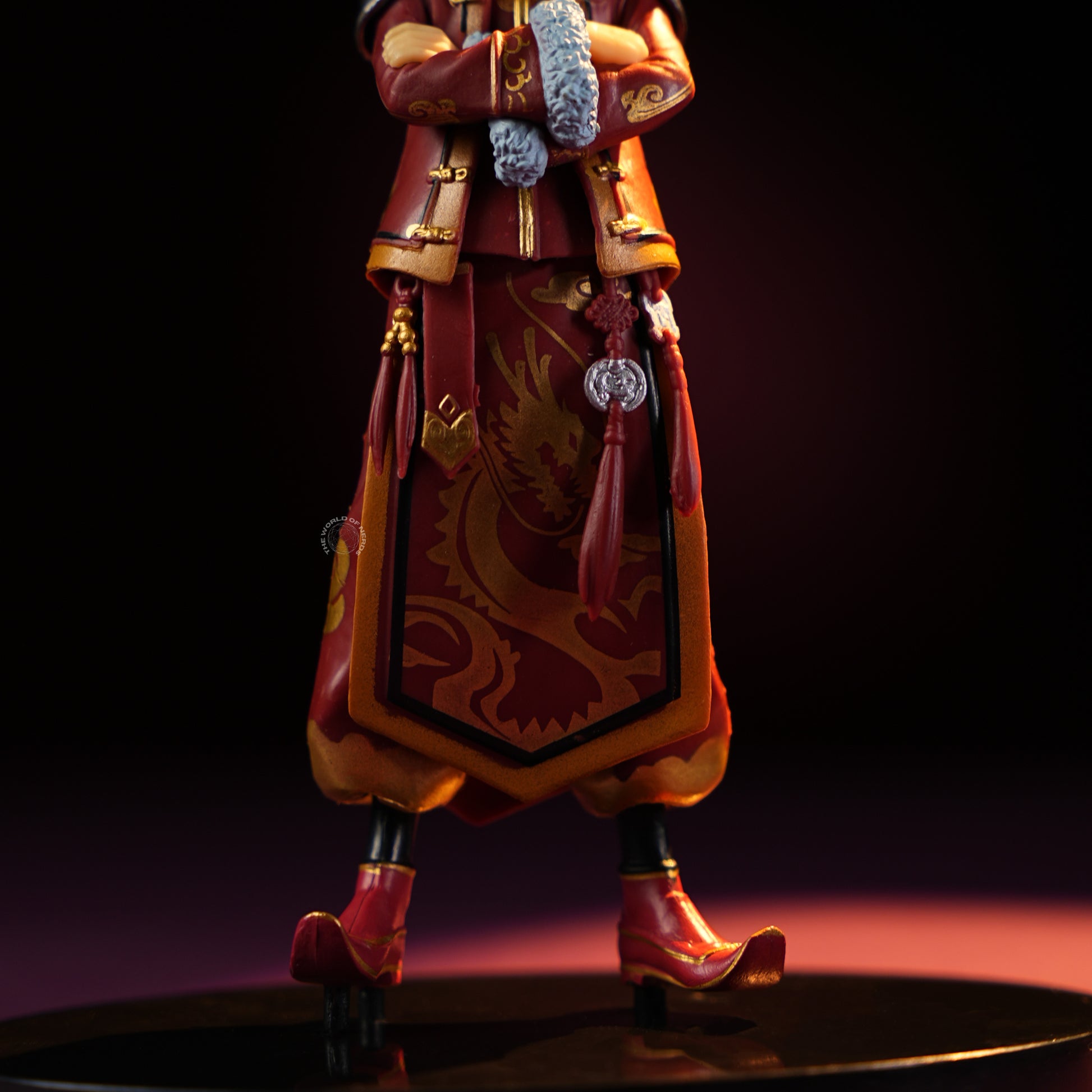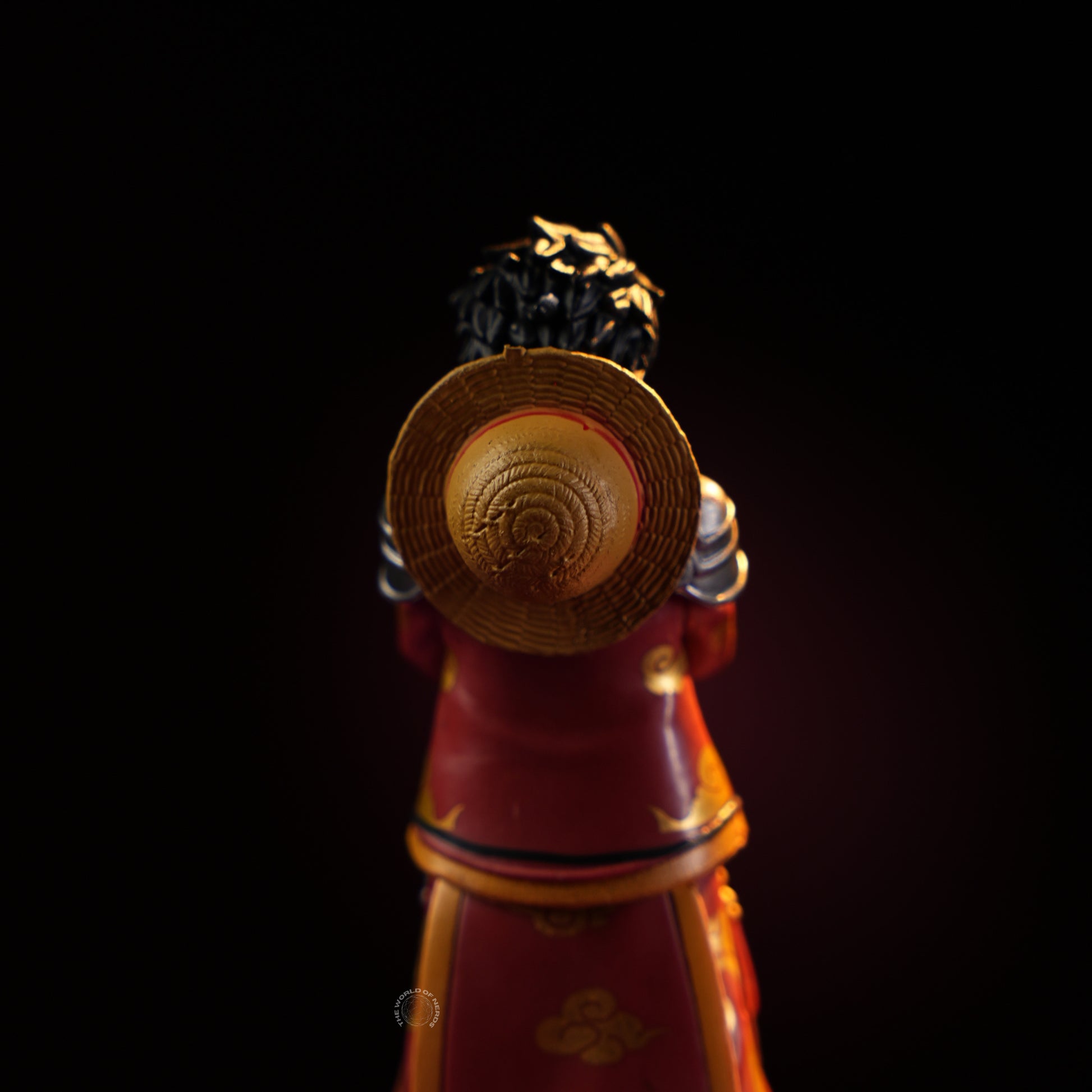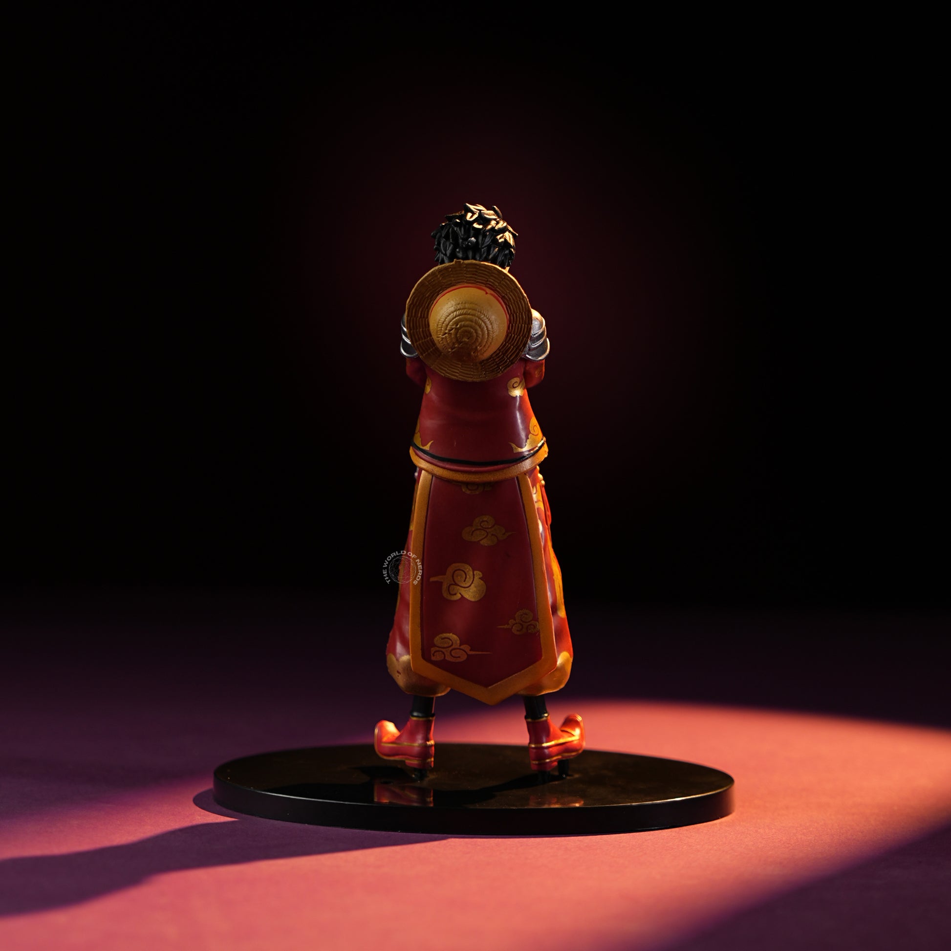 Standing around approximately17 cm tall, Monkey D. Luffy commands attention in his luxurious red imperial robe, richly decorated with golden dragon motifs and fur-lined details. His bold, crossed-arm stance perfectly embodies the fearless resolve of a pirate king combined with the regal poise of a true leader. Illuminated by a warm, focused light, the fine craftsmanship of his attire and accessories highlights every intricate detail, making this figure a stunning homage to the iconic One Piece captain.