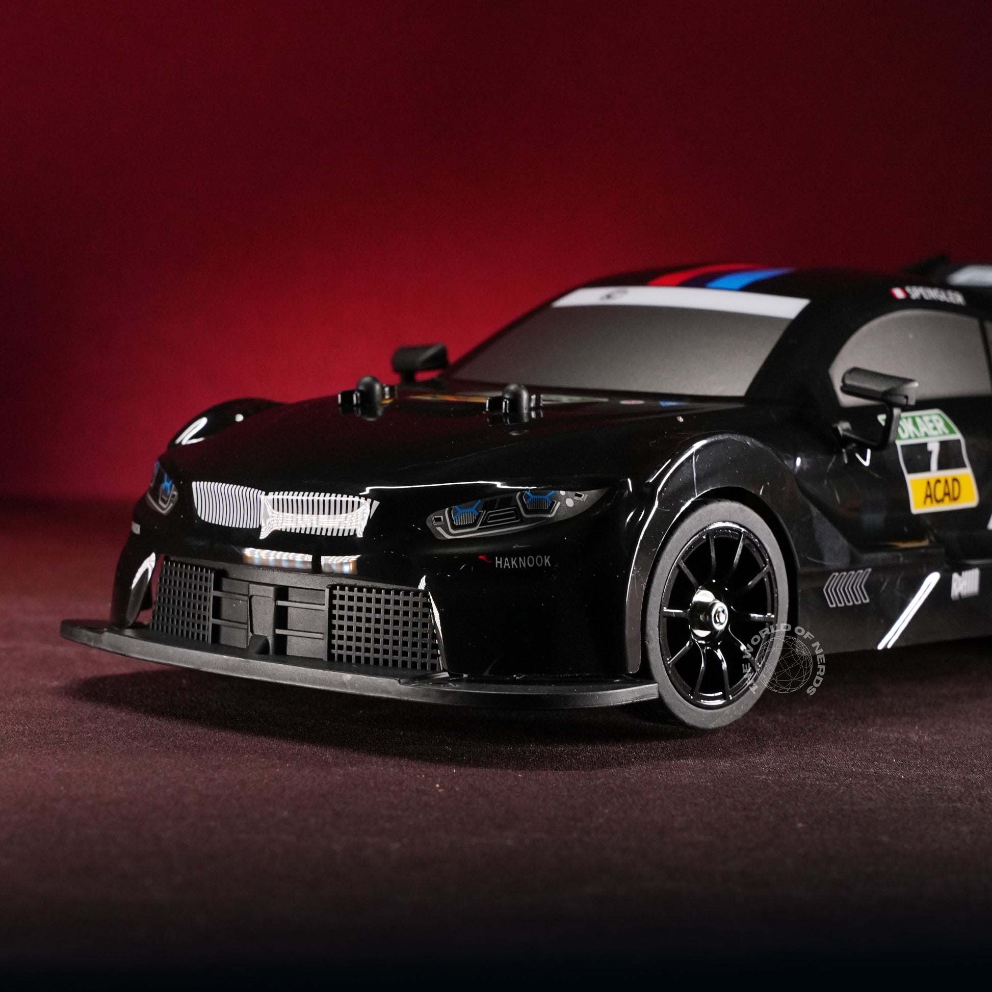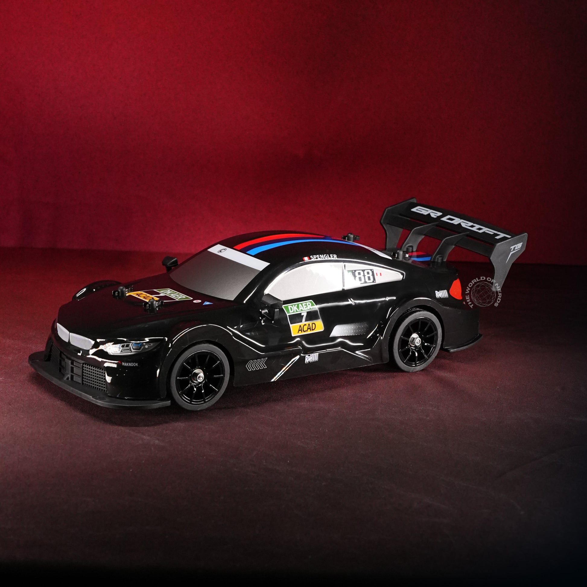 Zipping across a bold red race backdrop, this Top Gear-inspired 4WD RC car radiates speed and attitude. The black body, bold racing stripes, and Spengler #88 livery showcase a spirit of high-octane competition. With 4-wheel drive, underglow lights (with two light modes), and 2.4GHz control, every turn and drift feels precise and thrilling. The set comes fully equipped—with extra wheels and bright orange barricade cones—bringing professional touches to every lap and parking-lot showdown. This RC race car mixes nostalgia for epic street races with the rush of pushing boundaries, blending excitement, pride, and the boundless fun of mastering every maneuver on the track.
