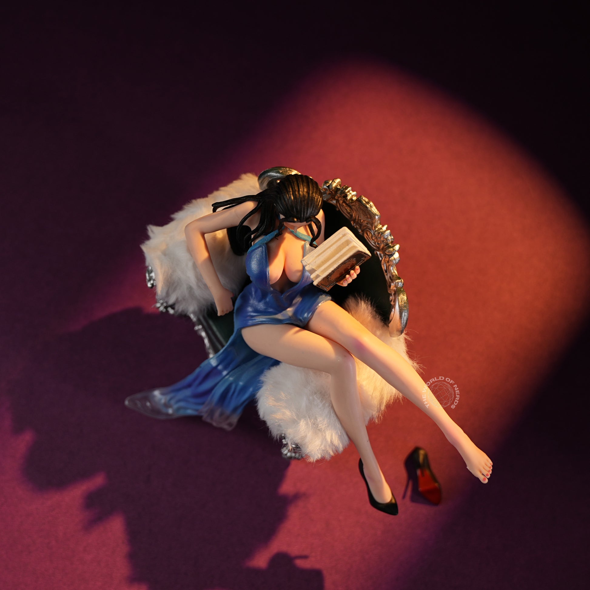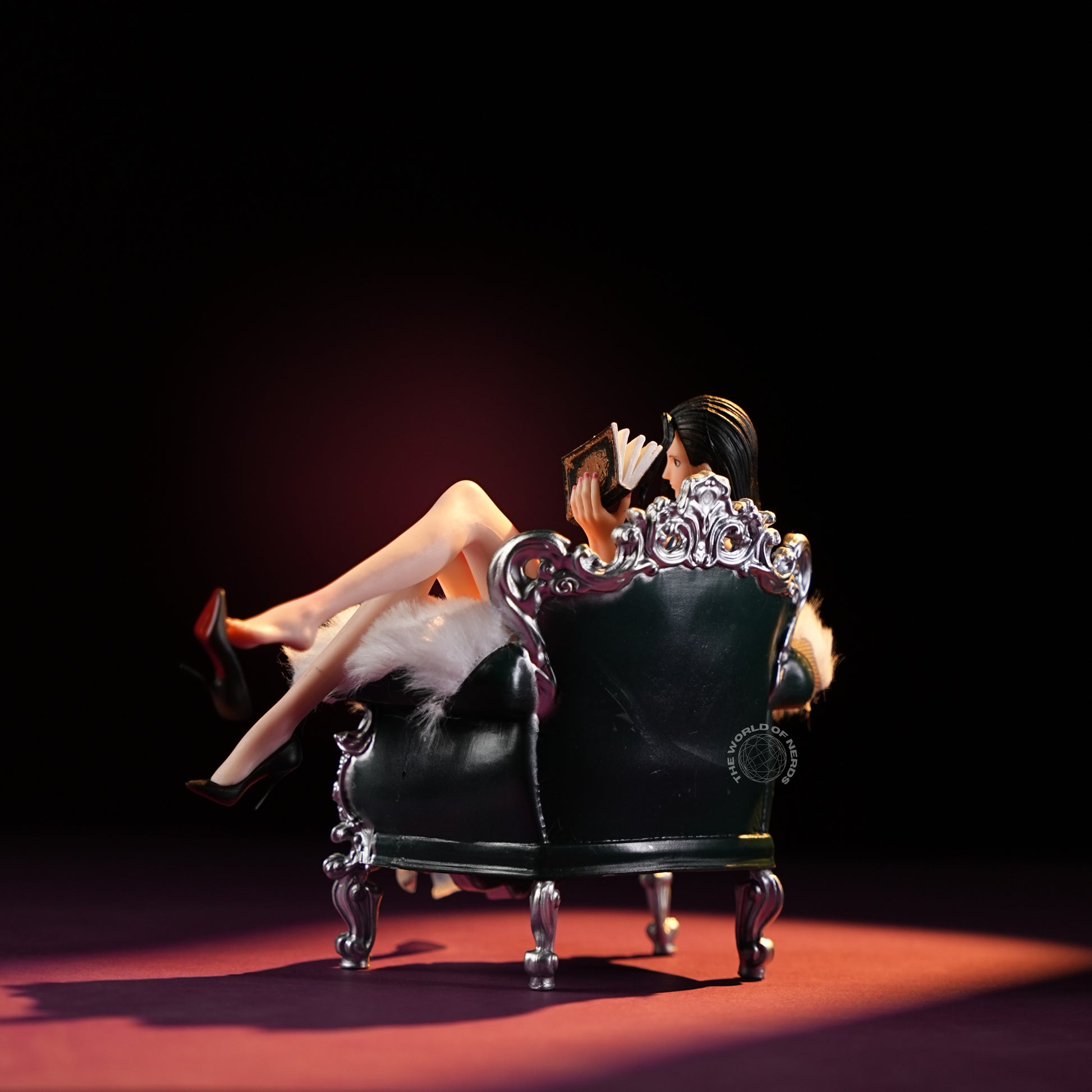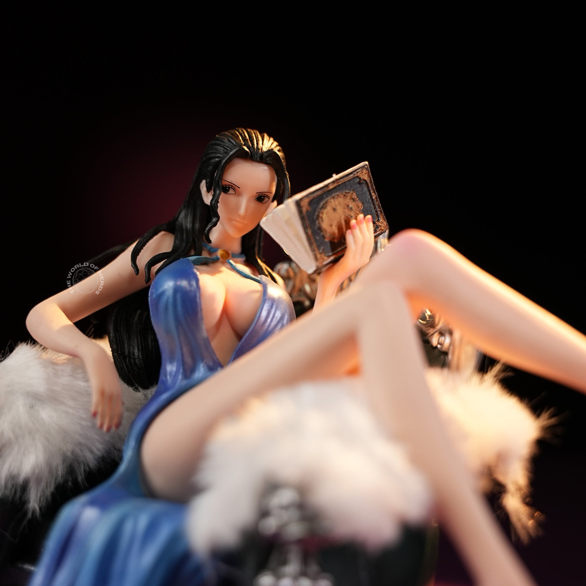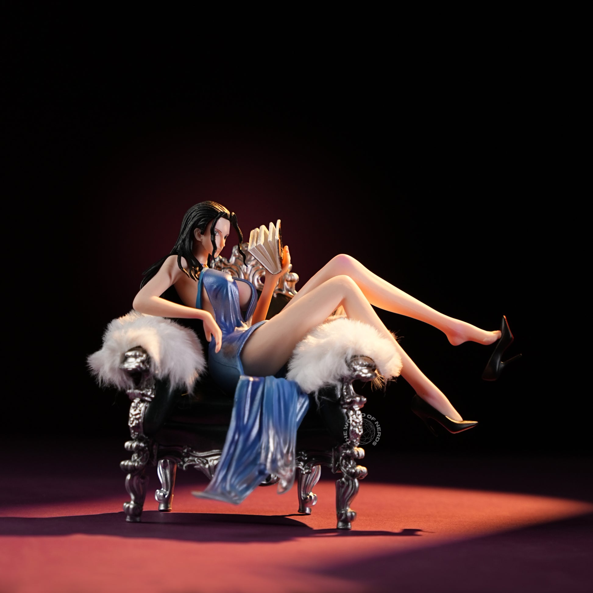 Measuring approximately 14cm tall and 18cm wide, Nico Robin exudes sophistication as she lounges with unhurried poise on an ornate silver chaise draped in white fur. Her flowing blue gown cascades elegantly, revealing graceful lines and a sense of effortless allure, while a novel occupies her gentle focus. Robin’s relaxed demeanor, paired with the refined setting and her poised high heels, creates an atmosphere of intellectual elegance and tranquil confidence—a scene that captures both her mystery and her warmth, inviting admiration and a quiet sense of longing.