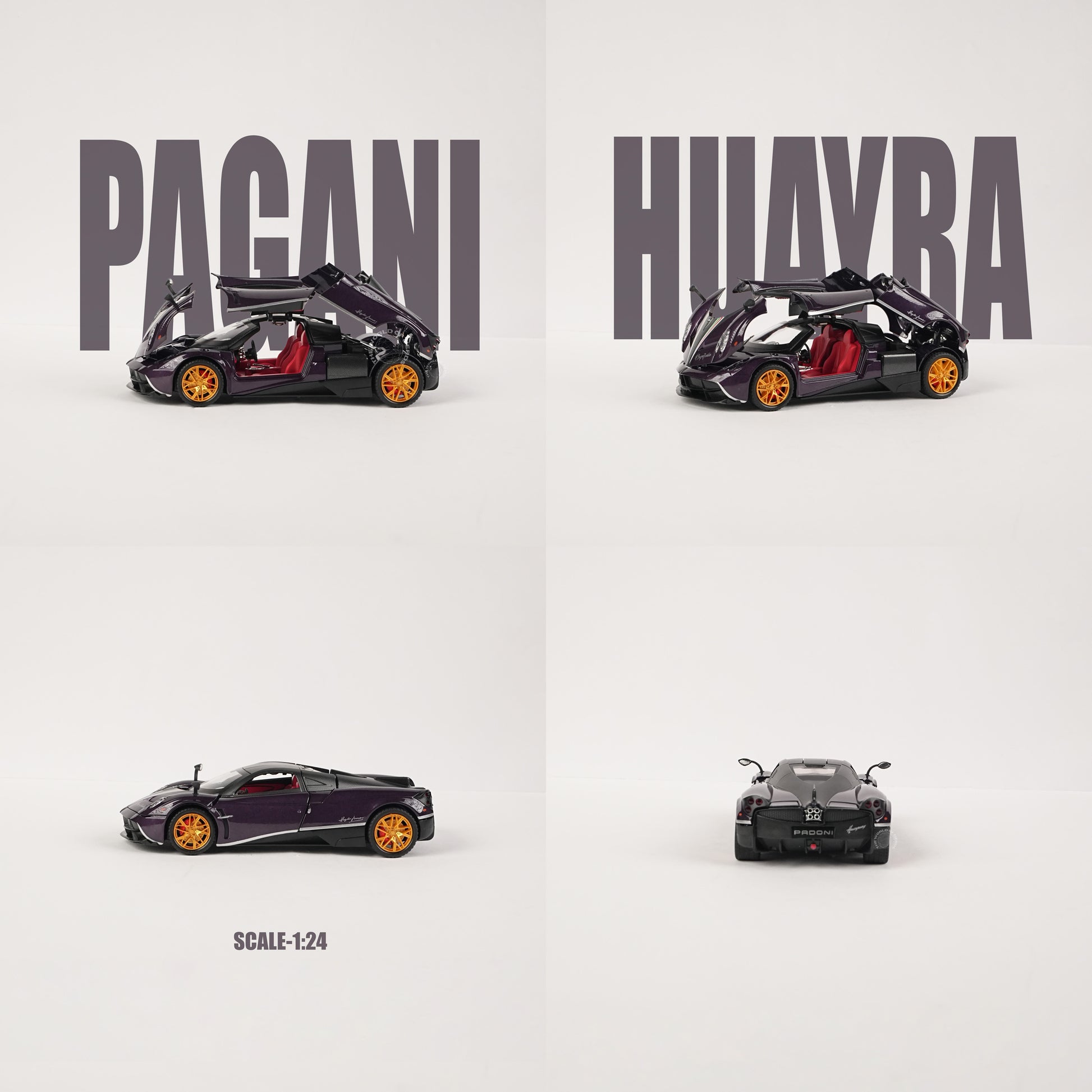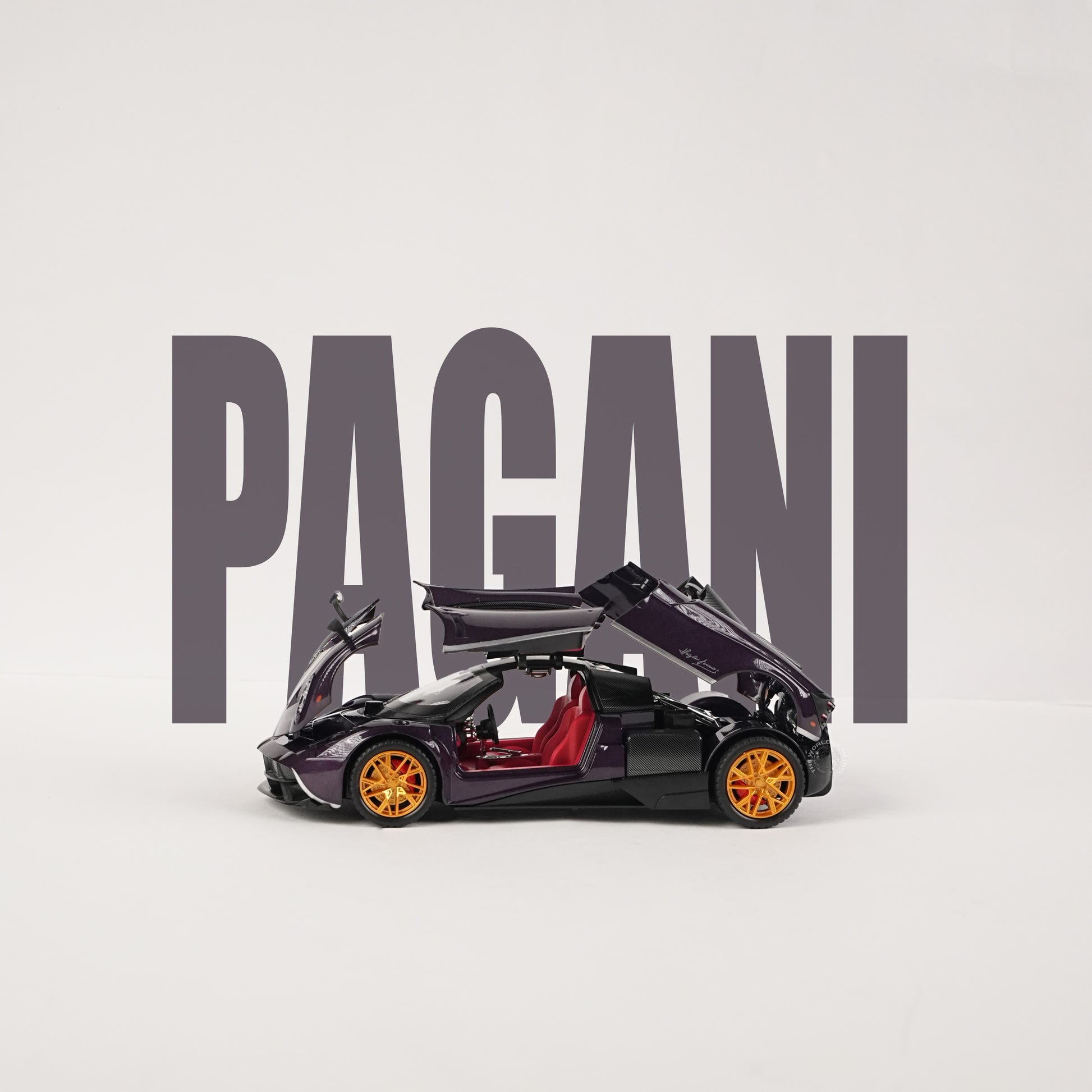 A captivating deep purple Pagani model, crafted in approximately 1:24 scale, steals the scene with its signature scissor doors lifted high under the bold “PAGANI” backdrop. Gleaming gold wheels and a vibrant red interior command attention, combining luxury and speed in a compact die-cast form. The car’s sharp lines and dramatic stance evoke the thrill of hypercar performance, while its scale invites collectors and dreamers alike to imagine the power and artistry of Italian engineering held in the palm of their hand.