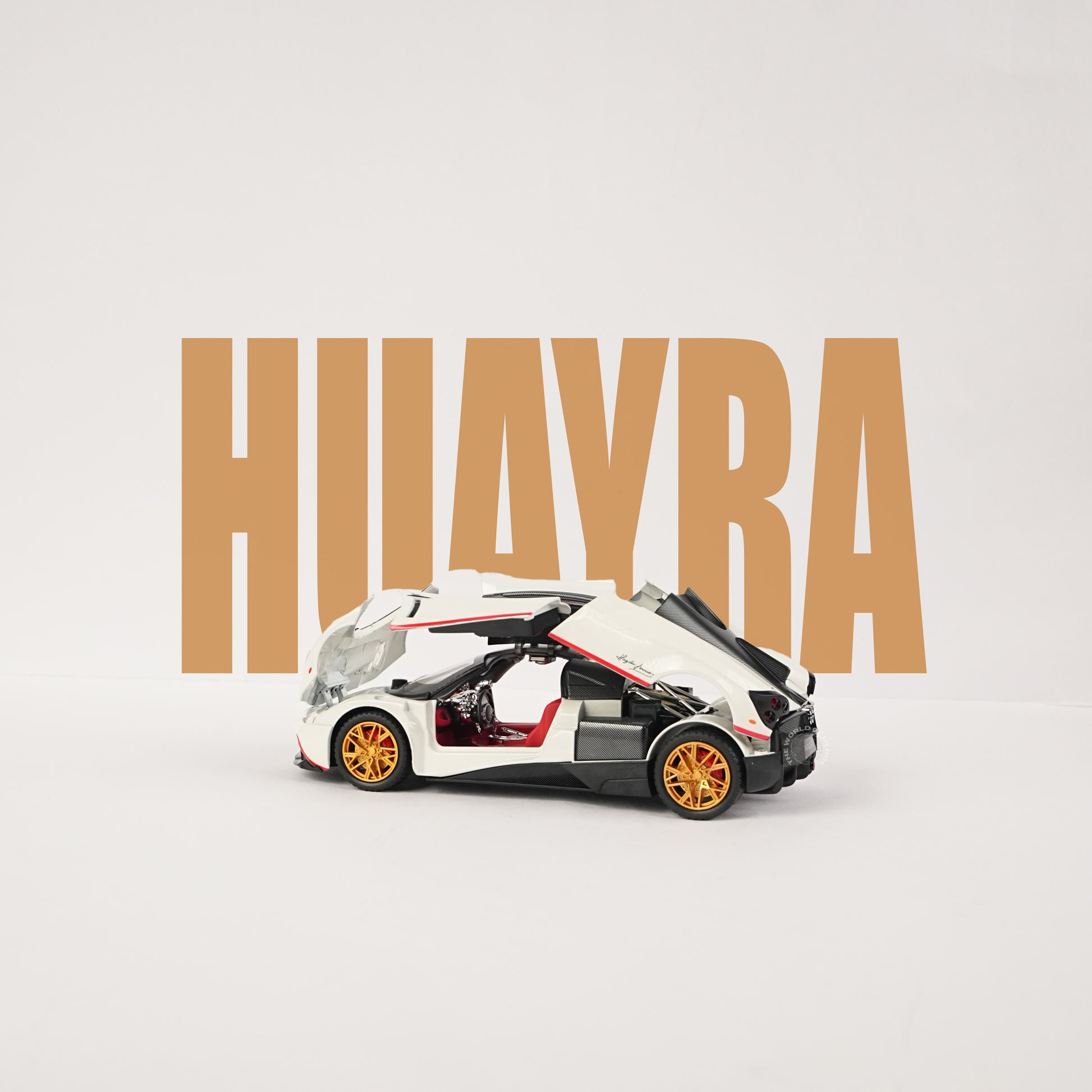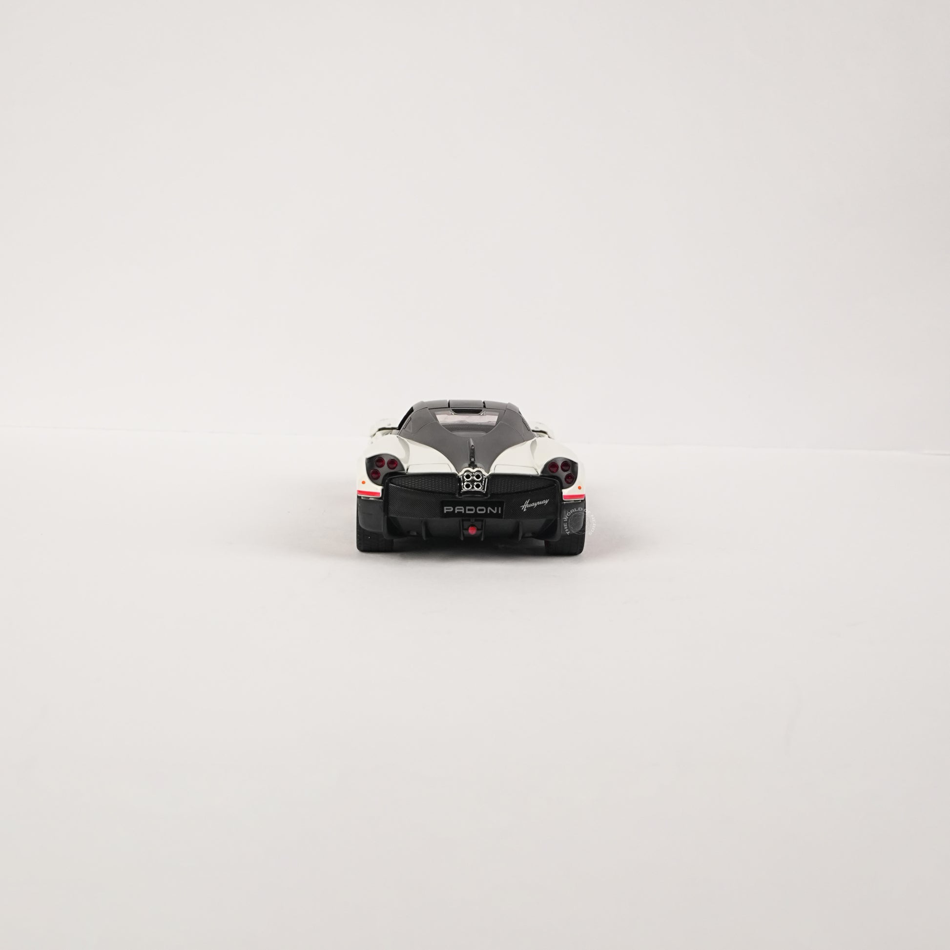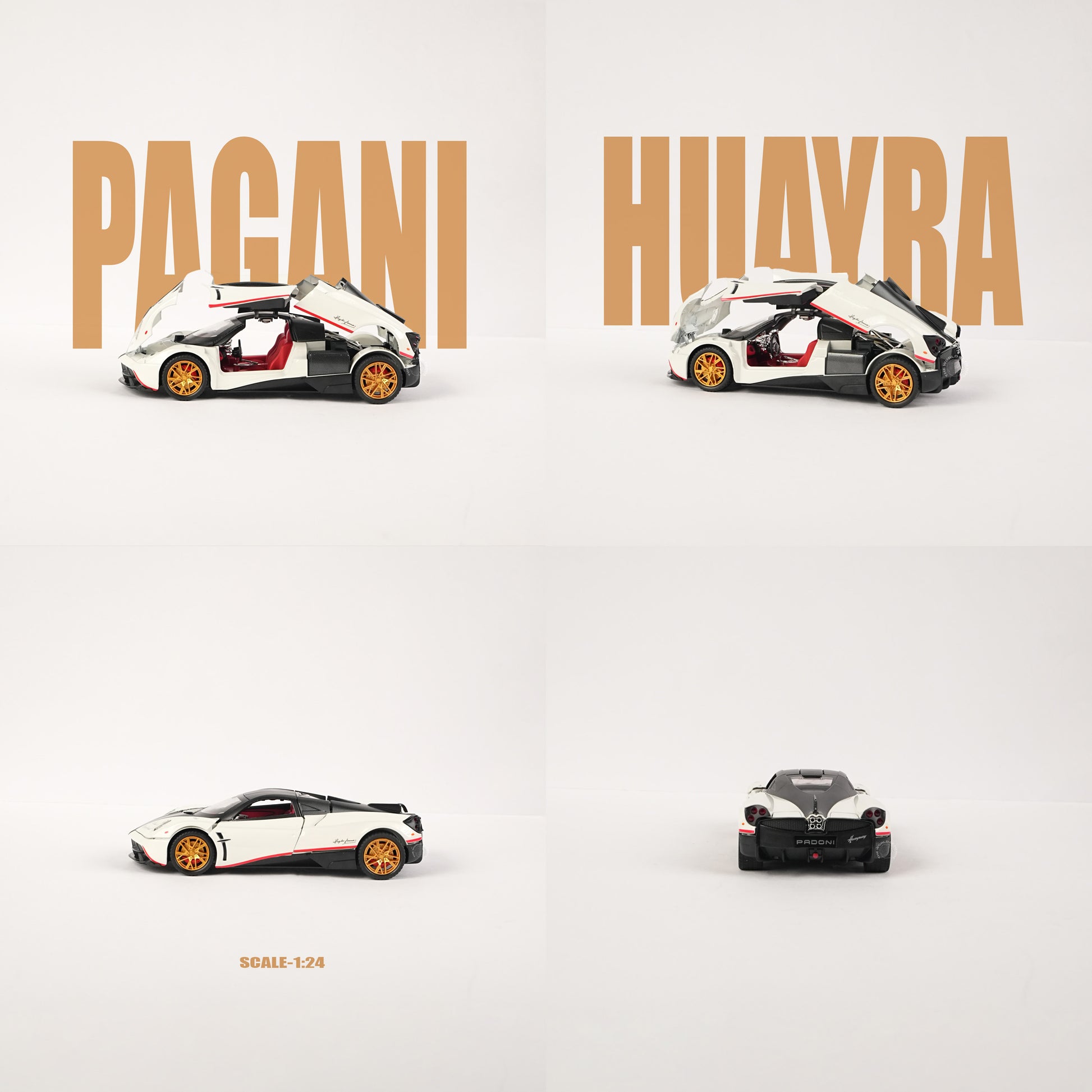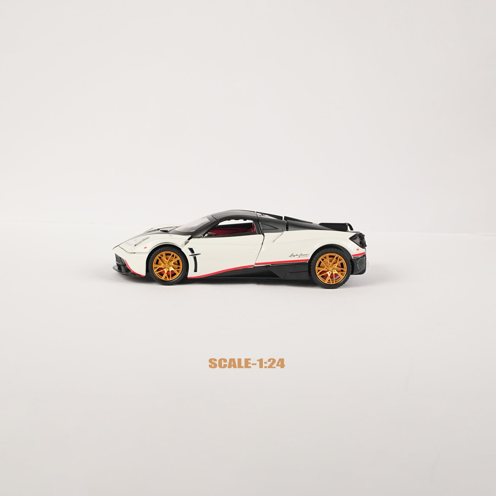 A gleaming white Pagani die-cast model, crafted at 1:24 scale, stuns with its open scissor doors and bold gold wheels, set dramatically against a powerful “PAGANI” backdrop. Red racing seats and precise cockpit details radiate supercar luxury, embodying the passion of Italian engineering. The compact form intensifies the allure, turning a legendary hypercar into a collectible centerpiece that balances the thrill of speed with the charm of miniature artistry—a celebration of innovation, elegance, and the irresistible allure of dream cars made tangible.