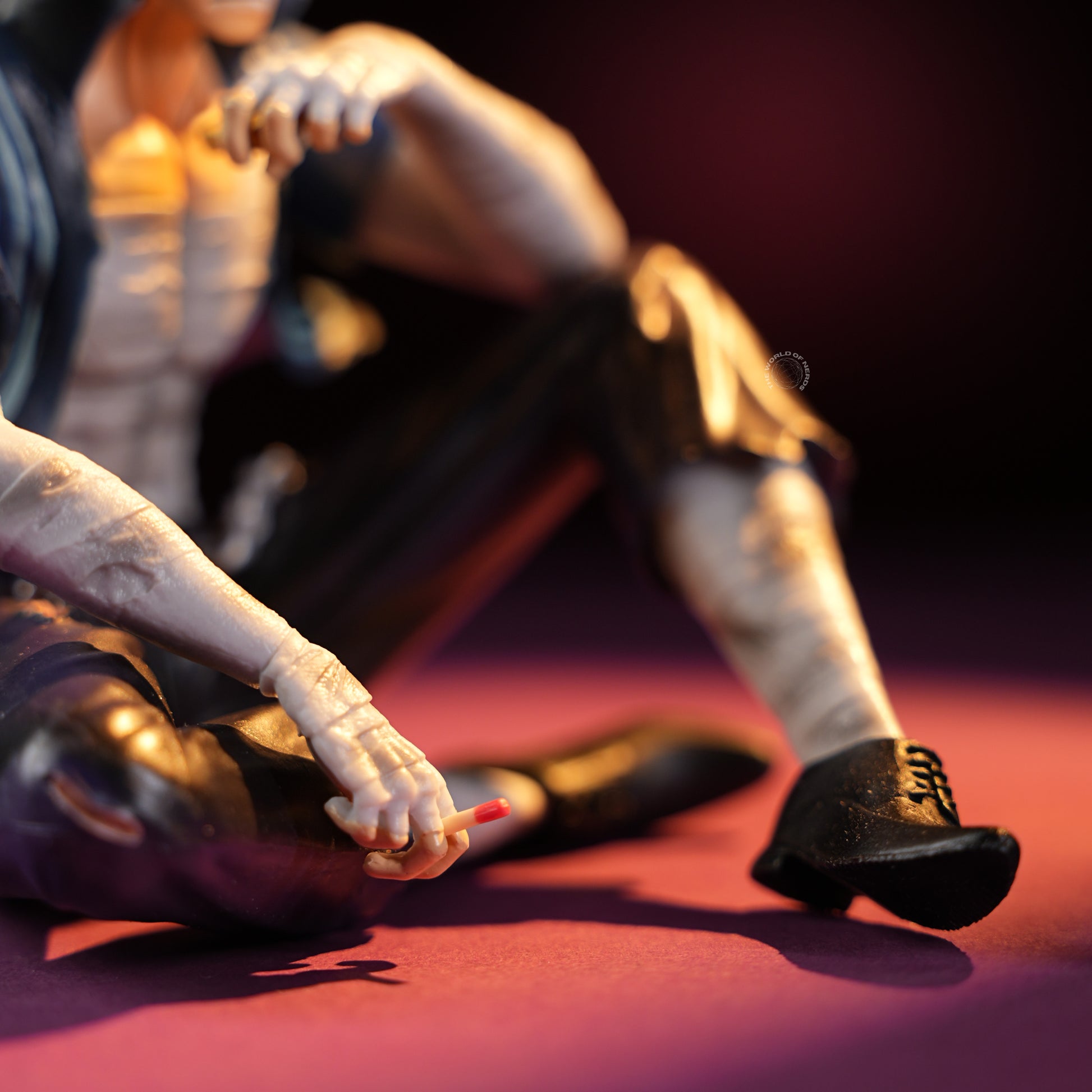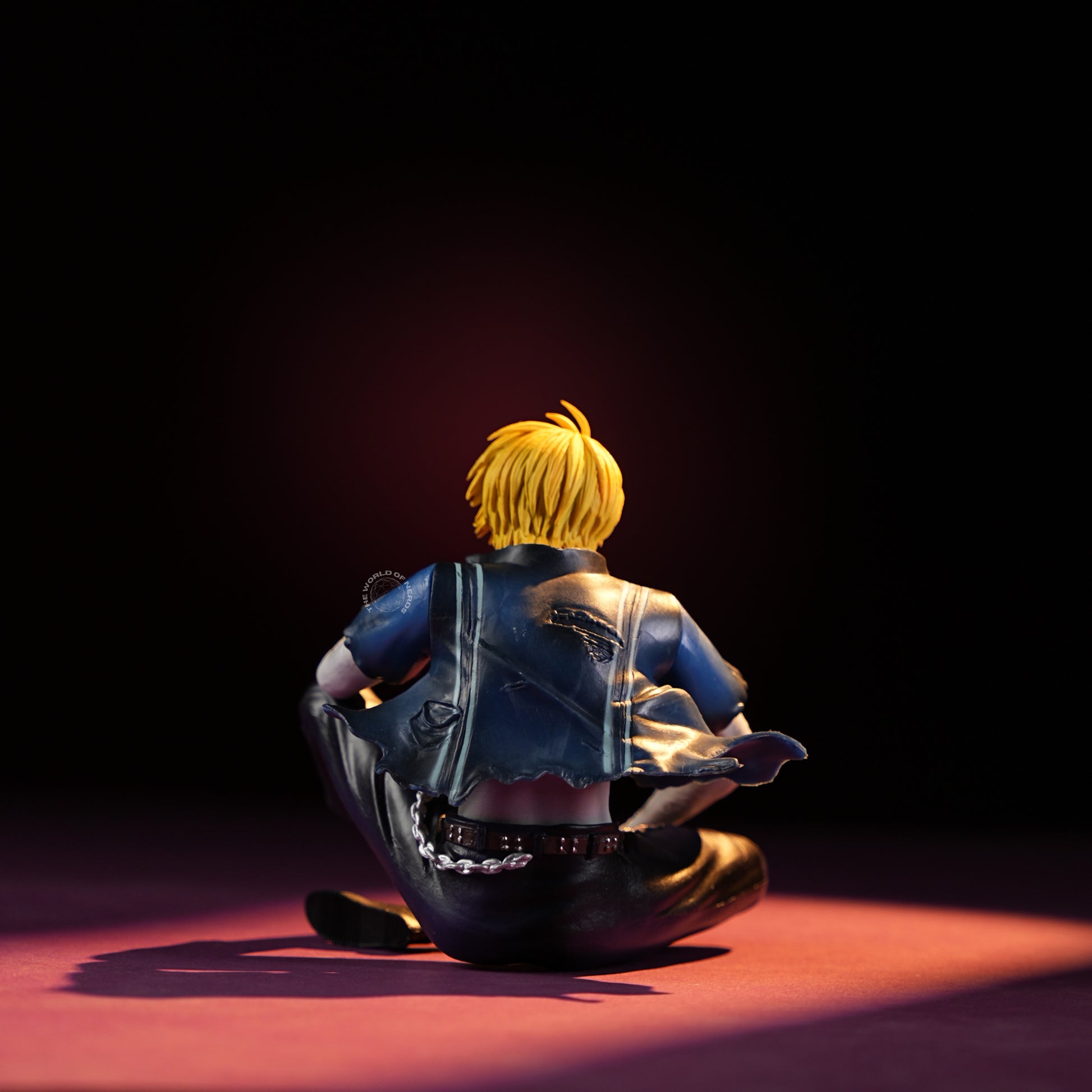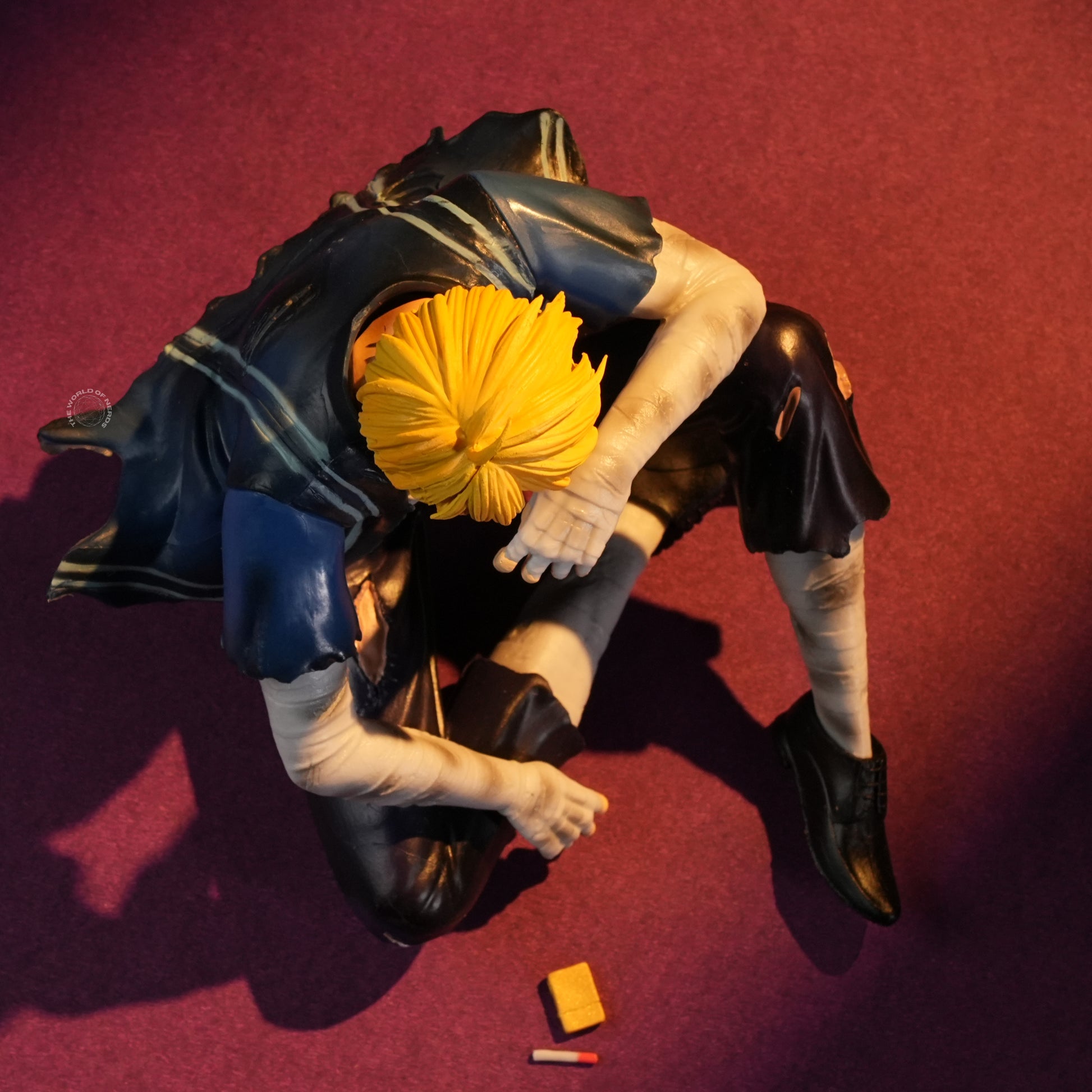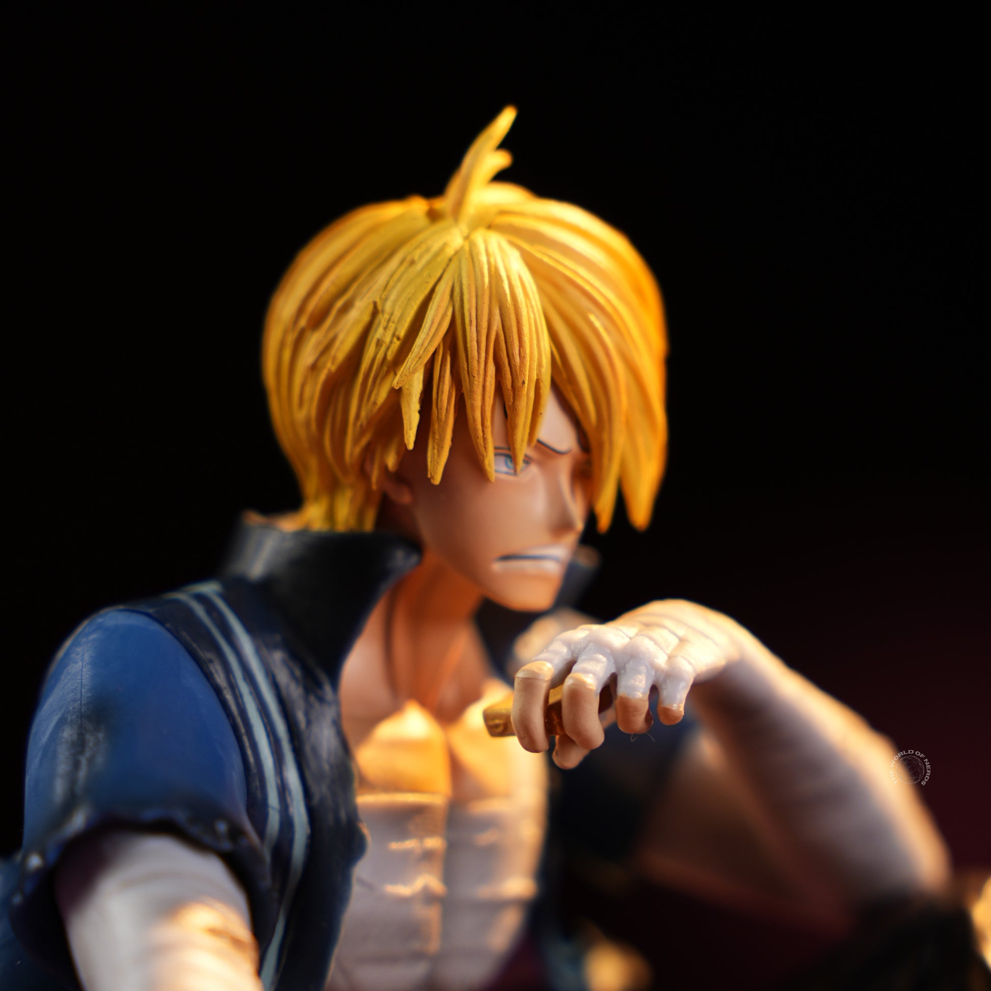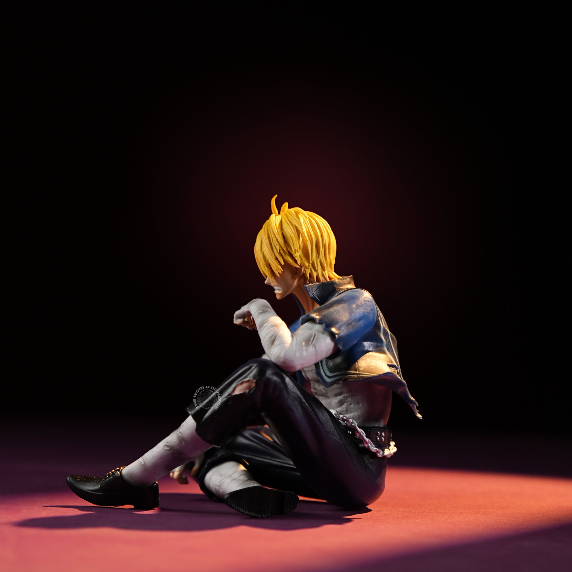 Measuring approximately 13cm in height and 9.5cm wide, Sanji sits cross-legged amid dramatic lighting, his muscles tensed and shirt open to reveal battle scars and bandages. One arm rests across his knee, the other pomposely set on his mouth, capturing both exhaustion and quiet contemplation. The worn clothes and scuffed shoes hint at a tough fight behind him, while the intensity in his posture reflects unwavering determination. This collectible figure beautifully blends vulnerability and strength, offering a touching tribute to Sanji’s enduring spirit and complex emotions.