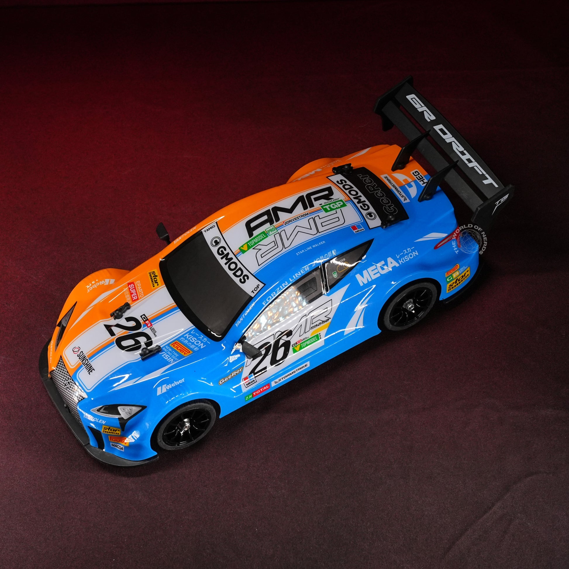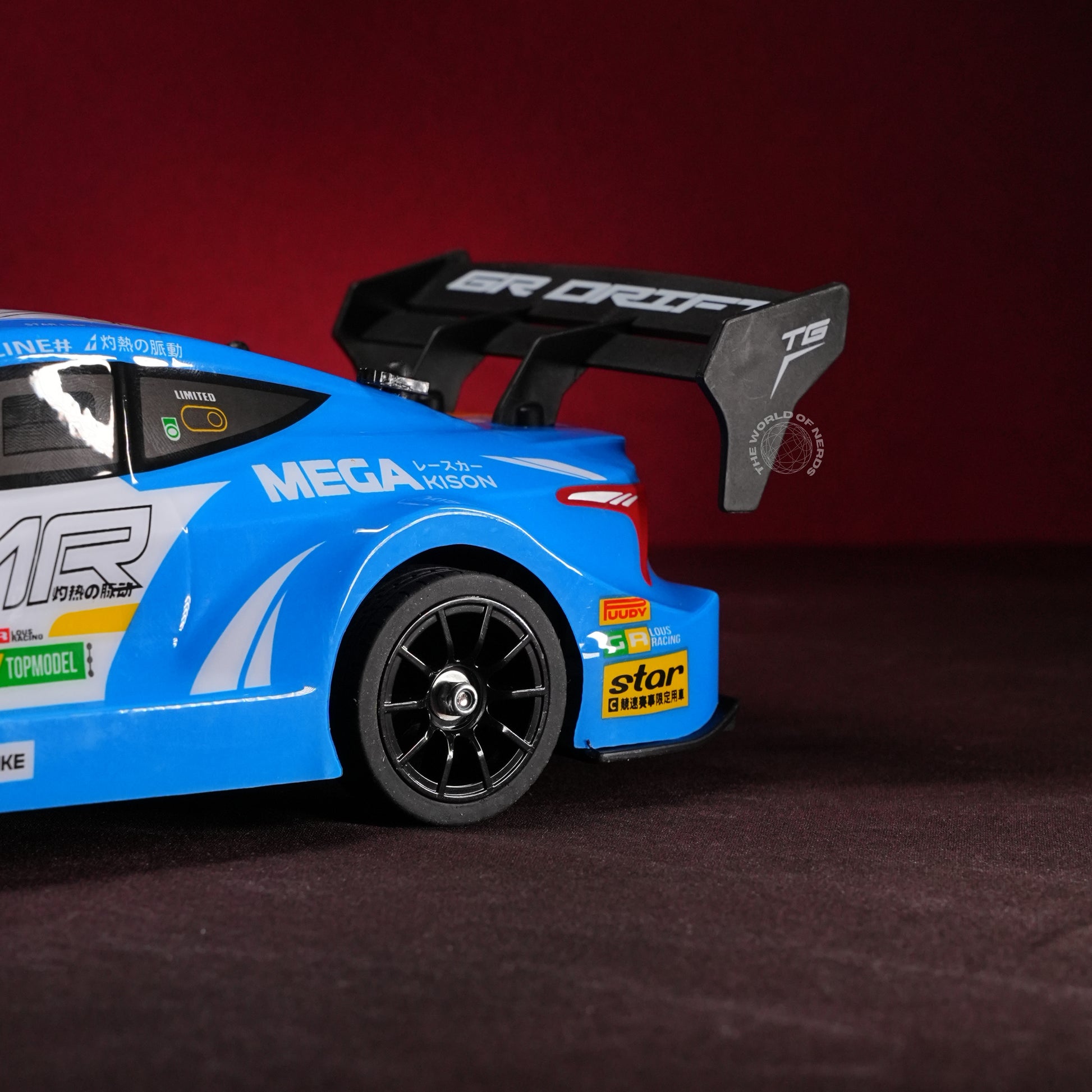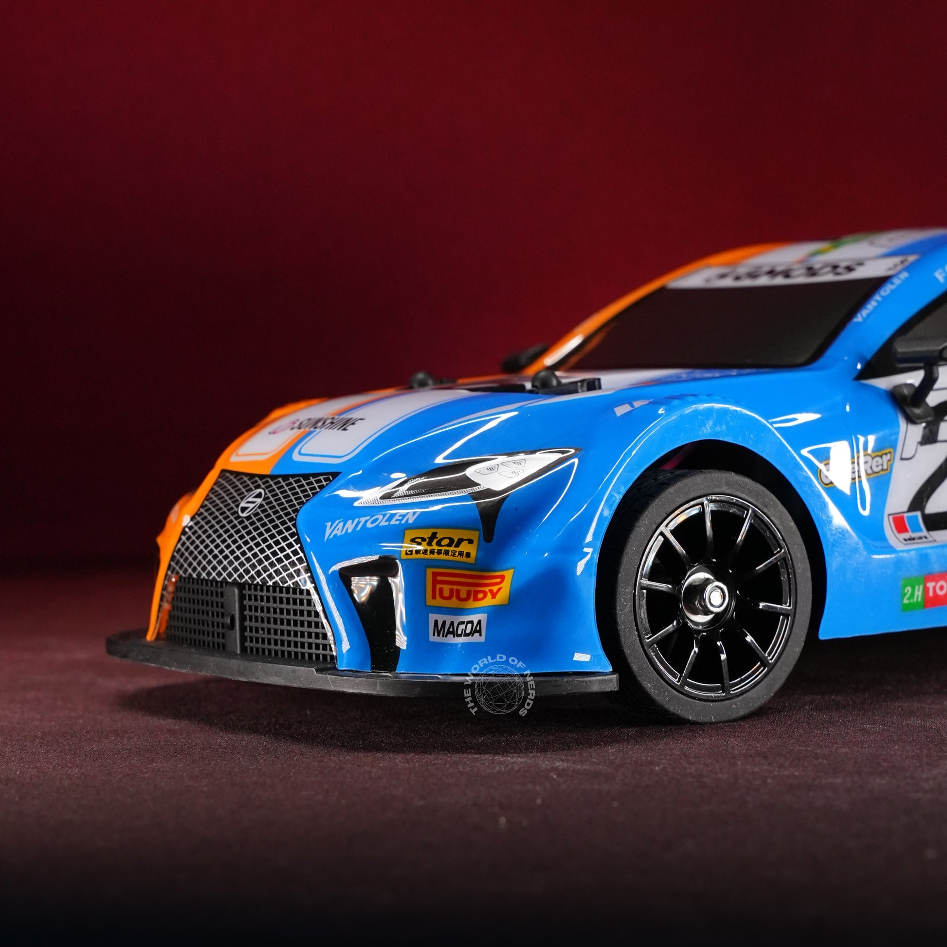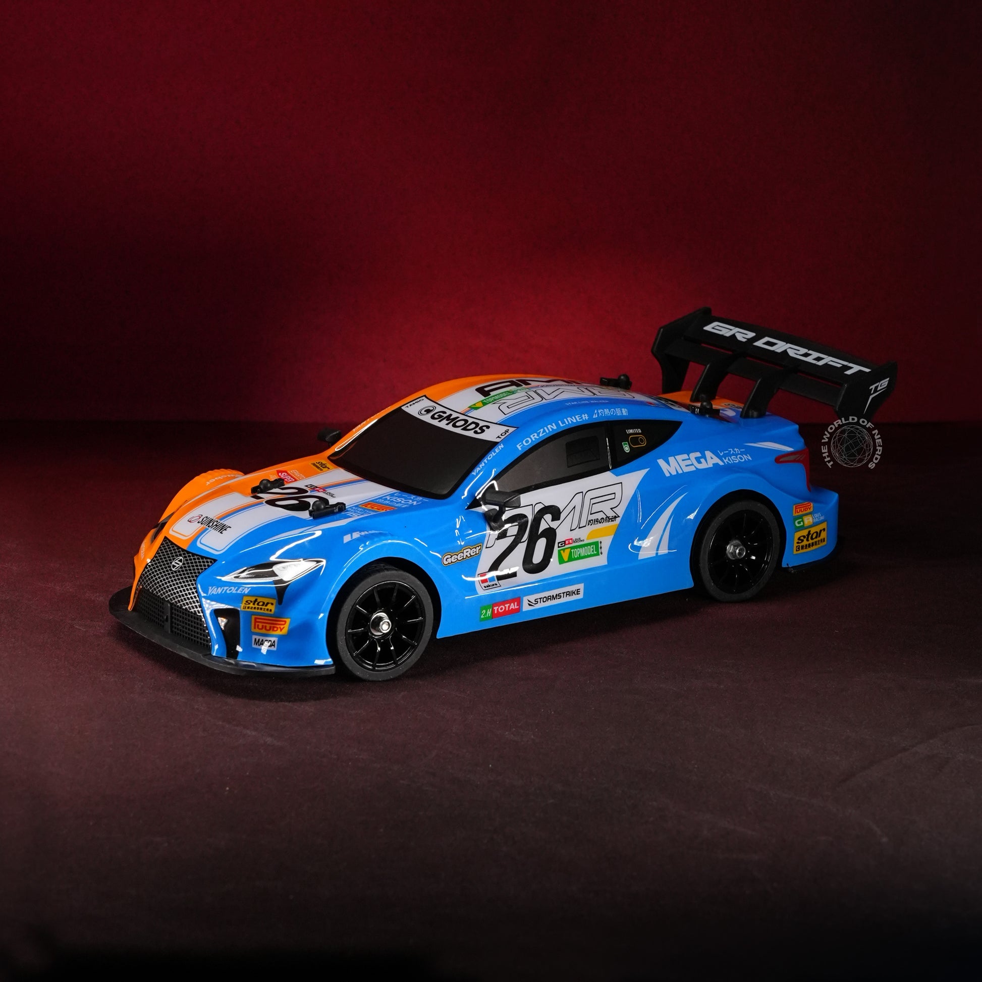 Drenched in vivid blue with bold racing graphics, the #26 RC race car stands ready for action, channeling the energy of pro circuits and high-speed sprints. Its 4-wheel drive system, underglow LED lighting (with two color modes), and grippy tires promise dynamic drifting and agile maneuvers, all controlled by a precise 2.4GHz remote. The package comes complete with extra wheels and barricade props, letting every user stage realistic street battles and obstacle courses. This car sparkles with nostalgia for legendary racing shows and the pure, competitive rush of mastering corners and dashes—fusing the thrill of victory with the joy of play in every fast-paced moment.