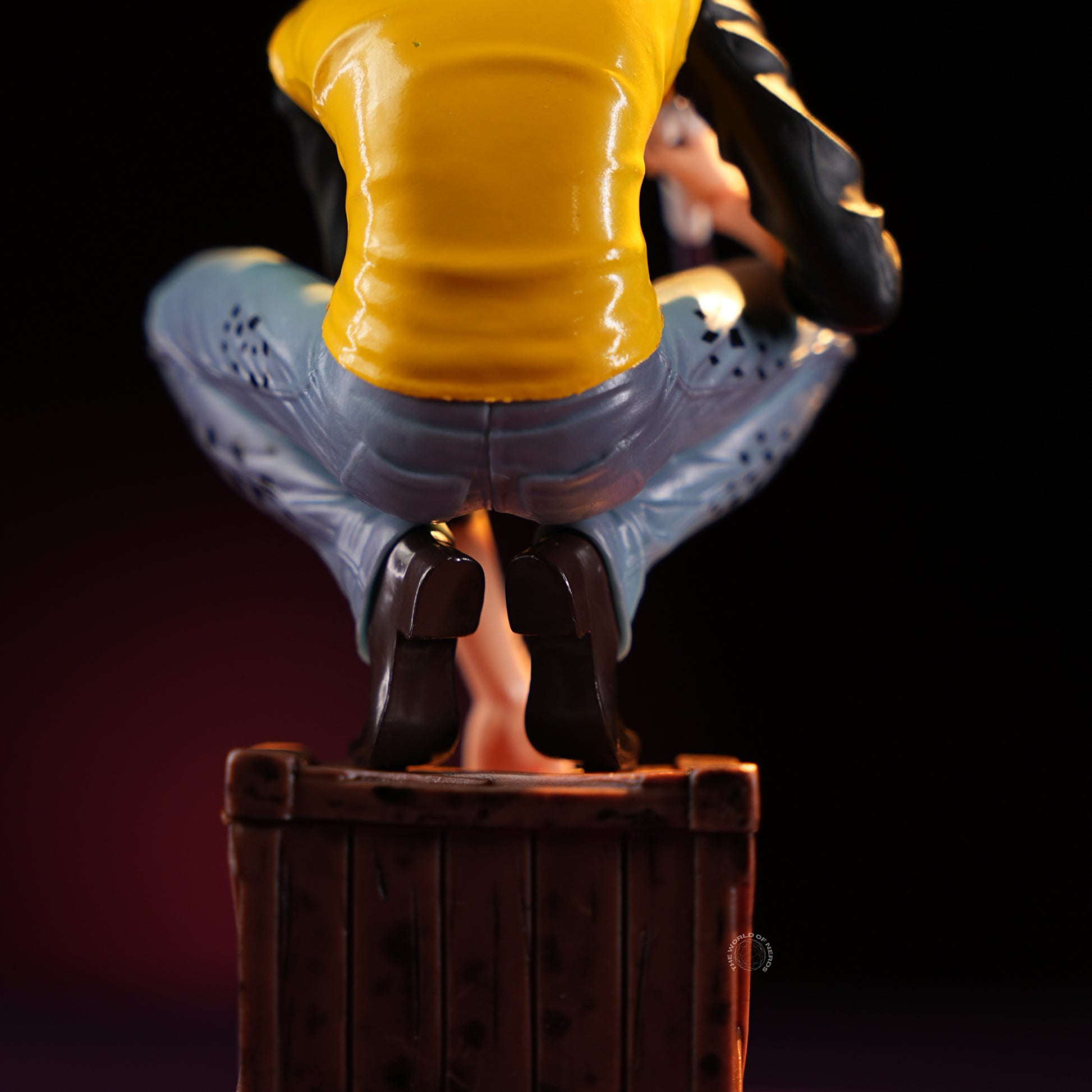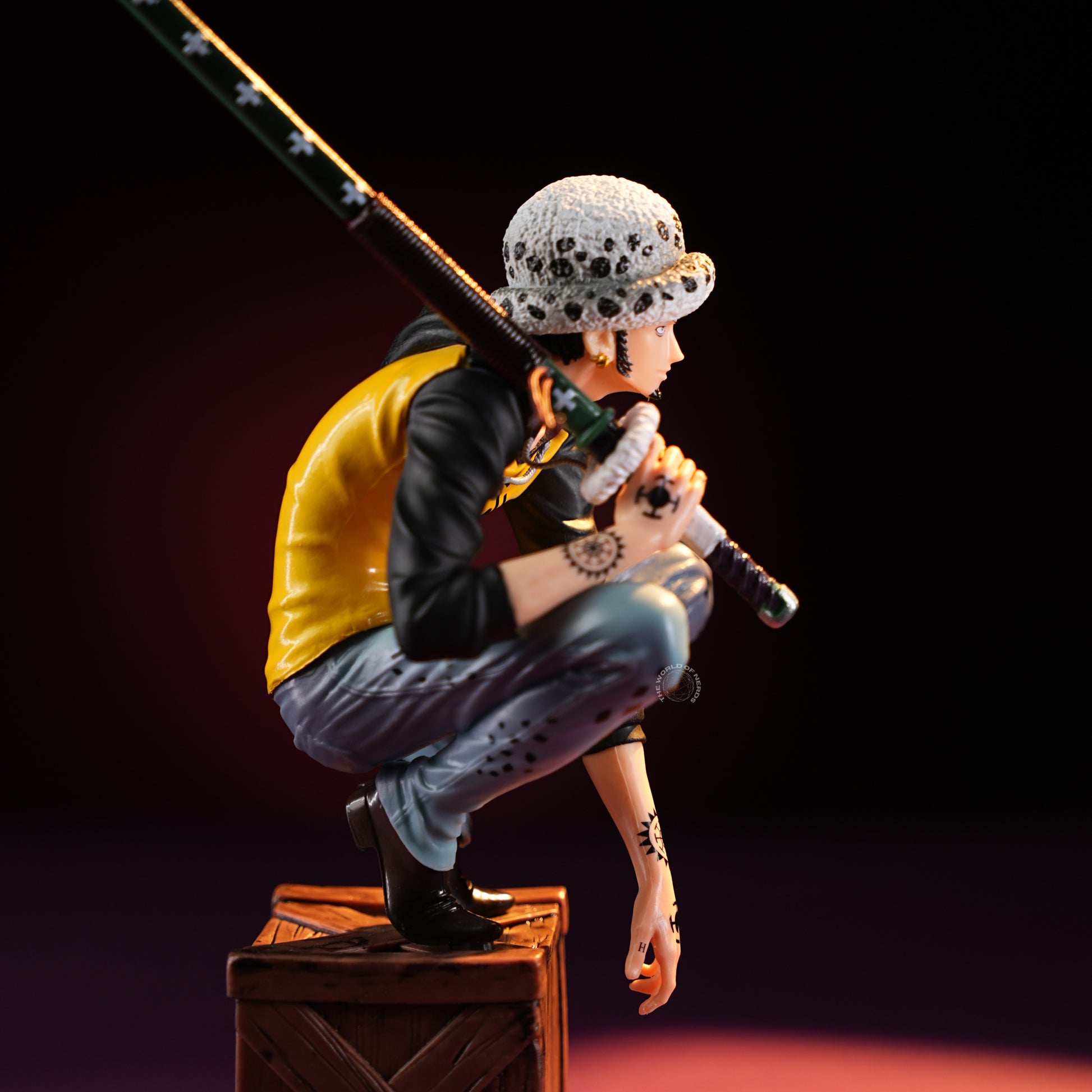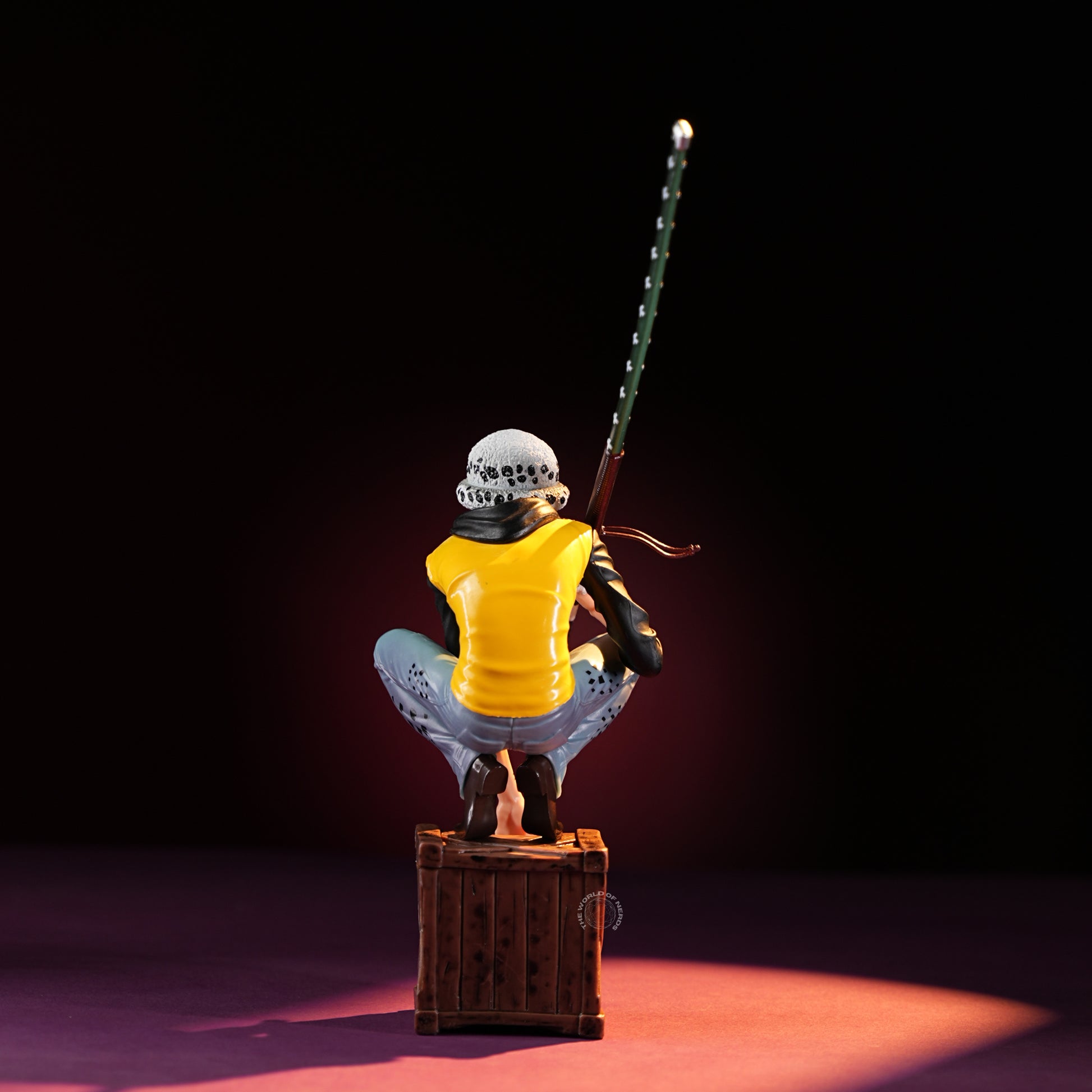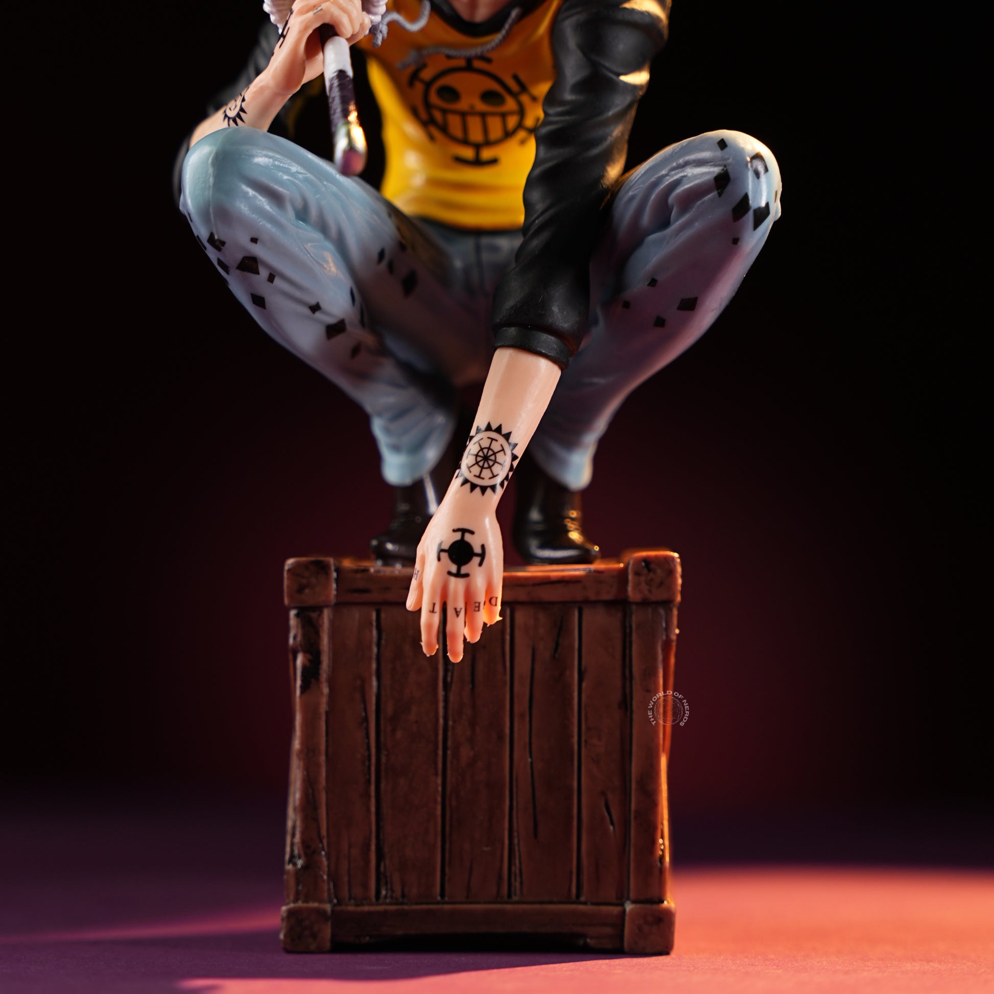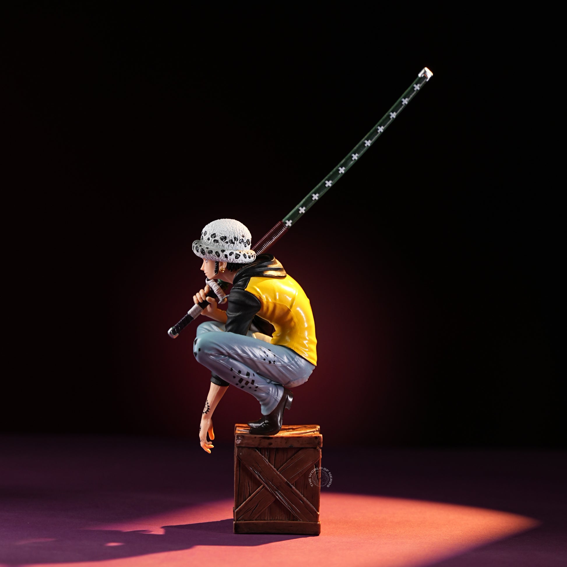Measuring approximately 26cm tall, Trafalgar Law crouches confidently atop a wooden crate, poised for action with his iconic nodachi sword resting across his shoulders. The meticulous detailing on his yellow hoodie, dark jacket, and spotted hat brings his signature style to life, while the intricate tattoos on his hands reflect his edgy persona. Under dramatic lighting, Law exudes a blend of intense focus and rebellious cool ― a lone strategist ready to face any challenge, his stance radiating determination and a hint of brooding resolve that fans of One Piece instantly recognize.